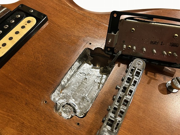 1980年製刻印ナンバードのPAFを搭載しています。コントロールは2Vol 2Tone 1Toggle SWで、ポットもオリジナルのままです。ピックアップはOH