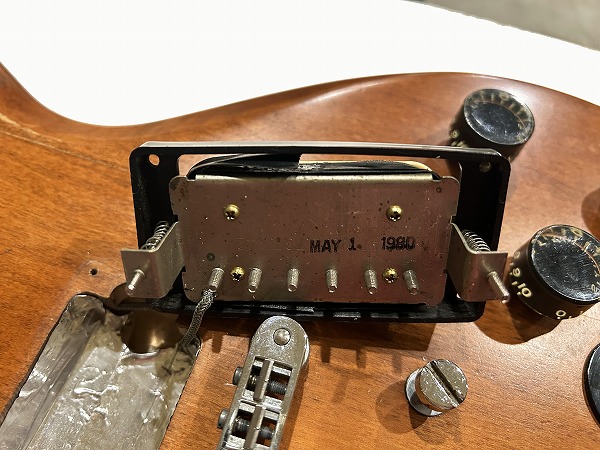 Humbackerとなっており、現在オリジナル搭載のものかどうか確実には不明ですが、背面に刻印ナンバードと「MAY 1 1980」のスタンプあり、オリジナルと同年式のGibson