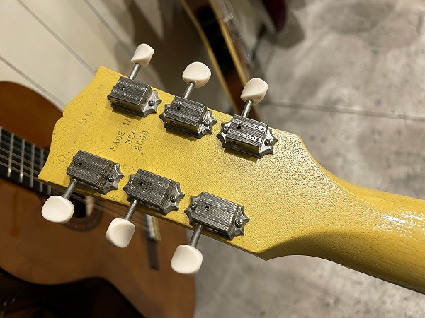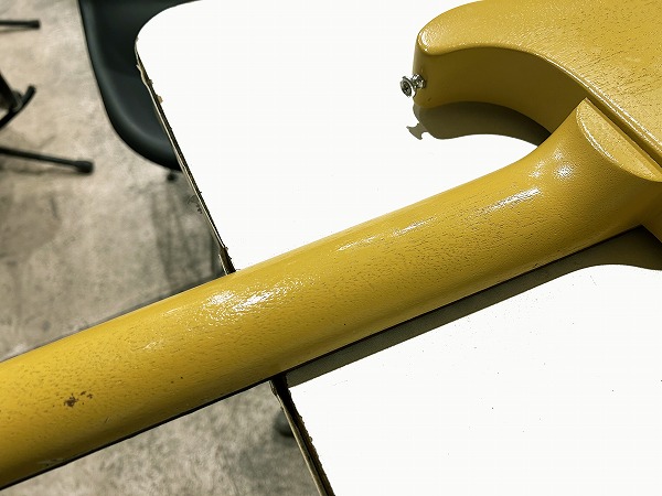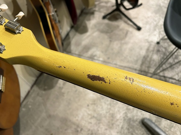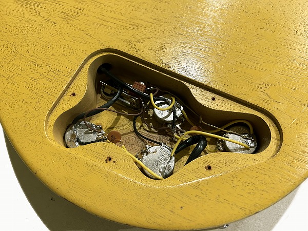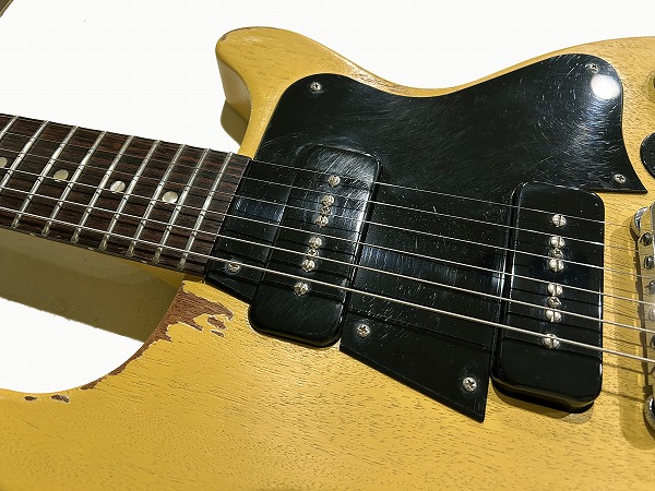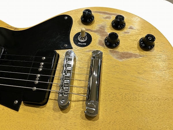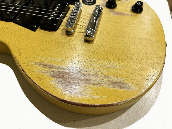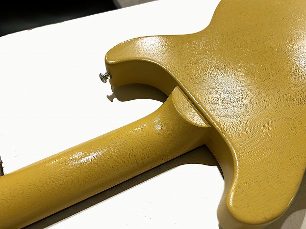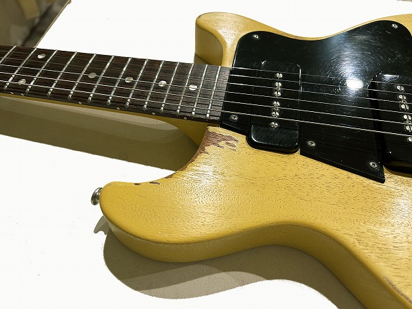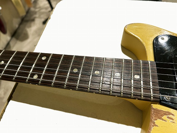 (レリックフィニッシュ)がどれくらいだったかは不明ですが)、エルボー部分やコントロール回り、カッタウェイ部やネック裏など、塗装落ちが表現されており、非常にヴィンテージライクな格好良いルックスです。TVイエローカラーとあいまって、ルックス的にも抜群の格好良さ、雰囲気を持った1本に仕上がっています。