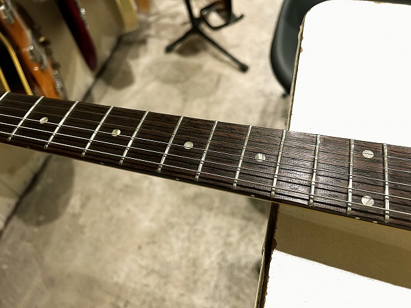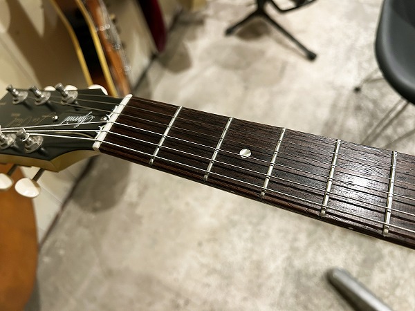プレイコンディションは良好です。ネックは真っ直ぐに調整済で良好な状態です。ロッドはまだ余裕があります。フレットは軽度の減り、使用感は見られますが、まだ8分程度は残っており、ローアクションセッティングで出音も良好です。丁寧に磨きも入れており、光沢も取り戻しています。指板も若干の使用感、小傷はありますが、大きな減りやダメージは無く、こちらも丁寧にクリーニング、コンディショニングを行なっています。各種メンテナンス、セッティング済で、弦高ローアクションで出音良好です。現在弦高は12フレット上1弦1.2mm、6弦1.5mmで、弾きやすく出音良好です。電装系も出音、コントロール共に問題ありません。良好なプレイコンディションです。
