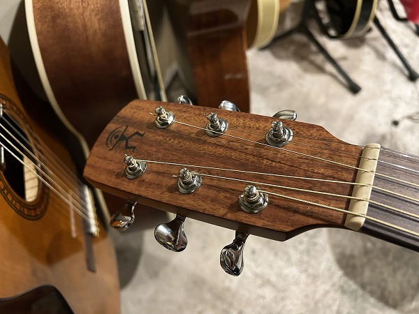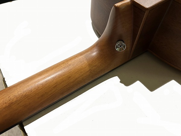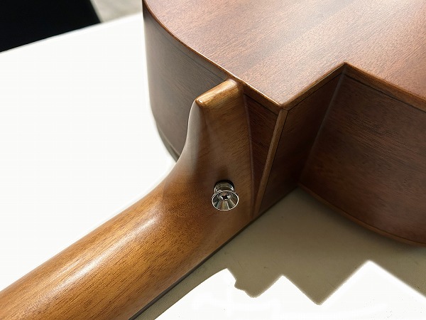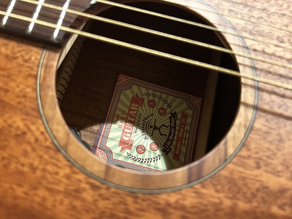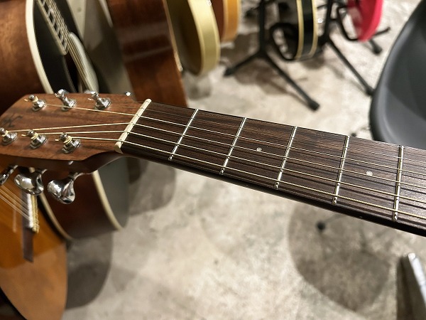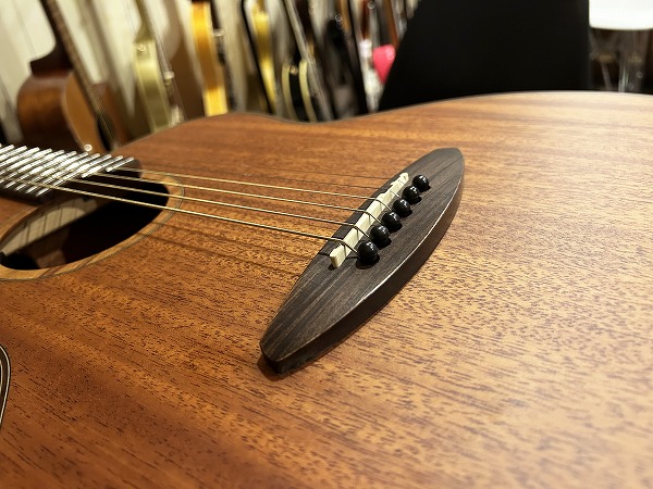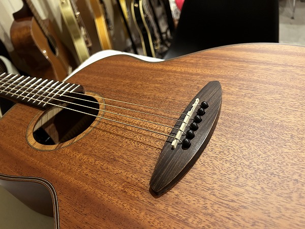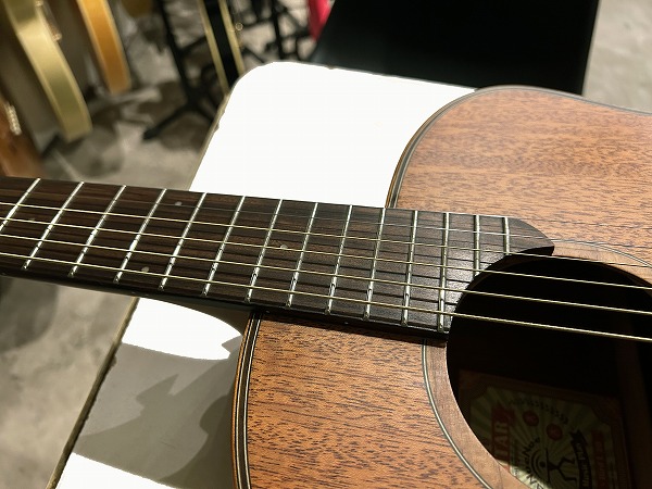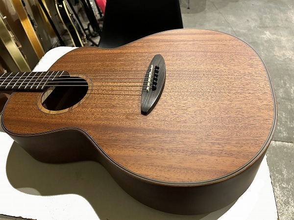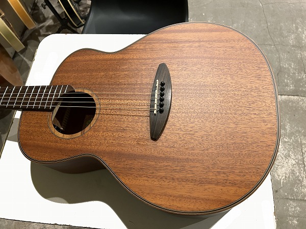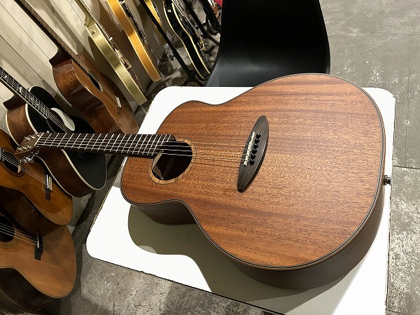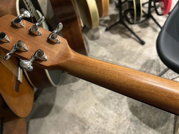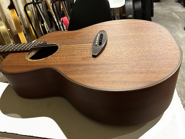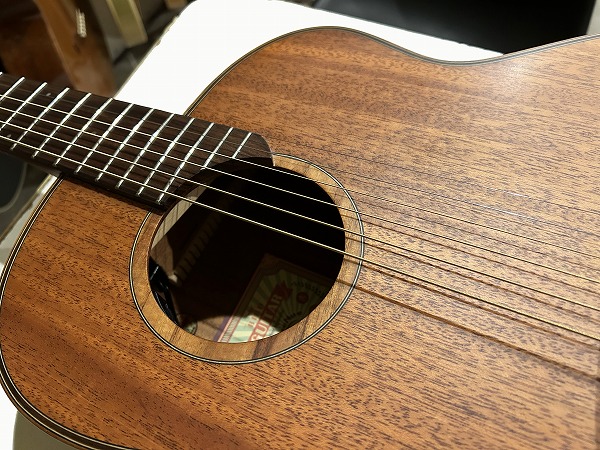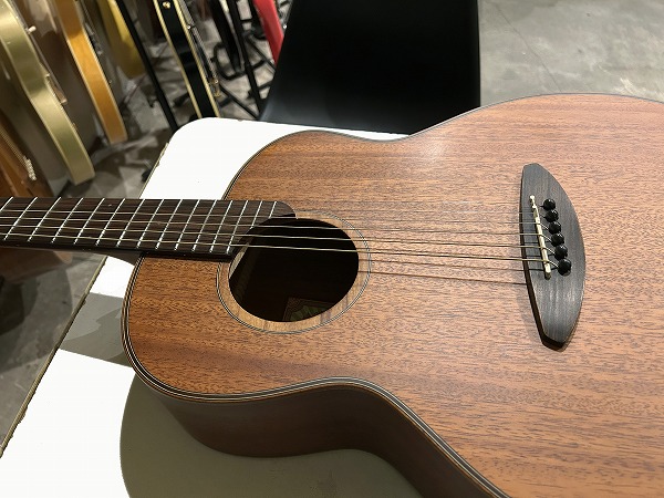 オリジナルのボディシェイプは胴がやや厚めに取られ、ふくよかな響きと鳴りを持っており、特徴的なセンターから少しずれた小さめのサウンドホールにより、より内部の共振も豊かになっています。非常に薄いサテンフィニッシュは、抜けの良さと乾いたトーン、木のトーン質感をよりダイレクトに表現し、生鳴り感も抜群です。トップは台湾マホガニーの単板仕様、サイド&バックはマホガニーの合板、ネックもマホガニーで指板はローズウッドといったスペックで、台湾マホガニーは通常マホガニーに比べ、より乾燥しやすく安定性に優れていると言われ、やや硬めで軽量との事。その特性の為か、より抜け良くブリリアントで乾いたトーンの印象です。マホガニーサイド&バック、マホガニーネックとのコンビネーションで、マホガニーならではのスイートさとタイトさも持ち合わせており、非常に音量感、生鳴り、響きの良い乾いた抜けの良いブリリアントなマホガニートーン、低音から高音までバランス良く豊かで、クリアーでドライな輪郭のはっきりとしたトーンで、とてもグッドサウンドで使いやすく、このプライスやルックスからは予想を超える生鳴り感とトーンを感じられるのではないかと思います。ナット幅44mm、スケール643mm、21フレット仕様でハイポジションは1弦側深めにカット入っており弾きやすいです。ナットは牛骨です。弾きやすく演奏性もとても良く、非常に良質なモデルです。抱えているとナチュラルな木の香りも感じられ、質感の良さも感じます。やはりフィンガースタイルでのプレイでより魅力を発揮する1本ではないでしょうか。