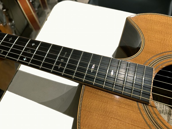 ルックスもとても上品で良い1本です。モデル名にも付けられた、ボディバインディング部やロゼッタのヘリンボーン、ボディやネックのメイプルバインディングとシンプルながら上質で品の良いルックスが魅力です。指板インレイはスノーフレイク&キャッツアイ、ヘッドロゴは「Meiko」仕様です。サウンドホール内ラベルの表記は「Hand-Crafted