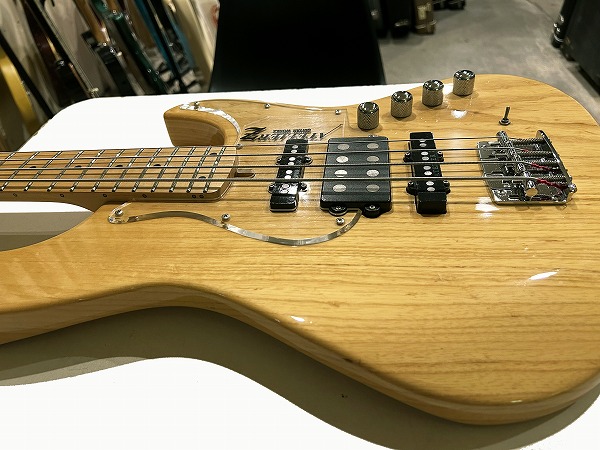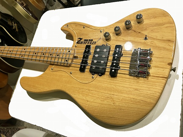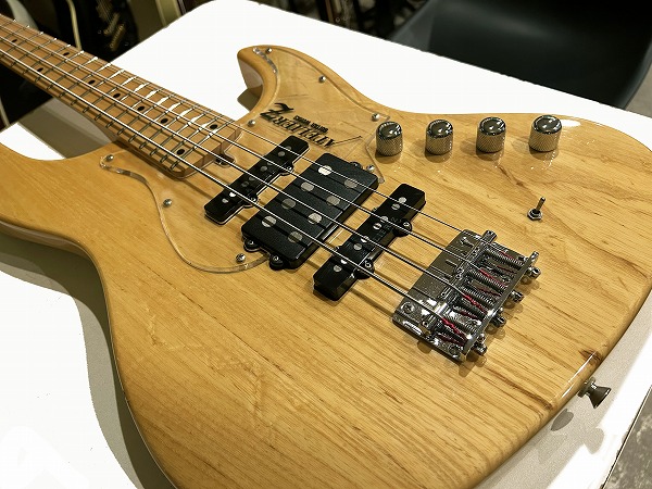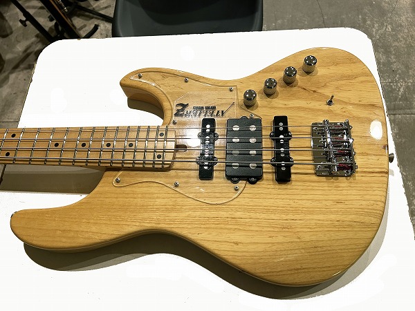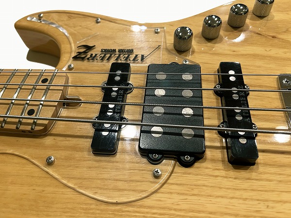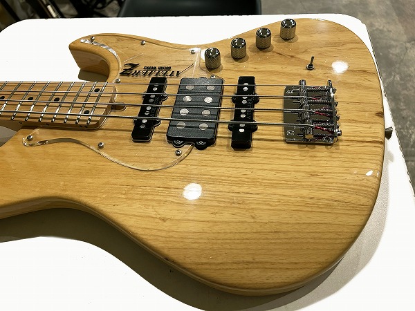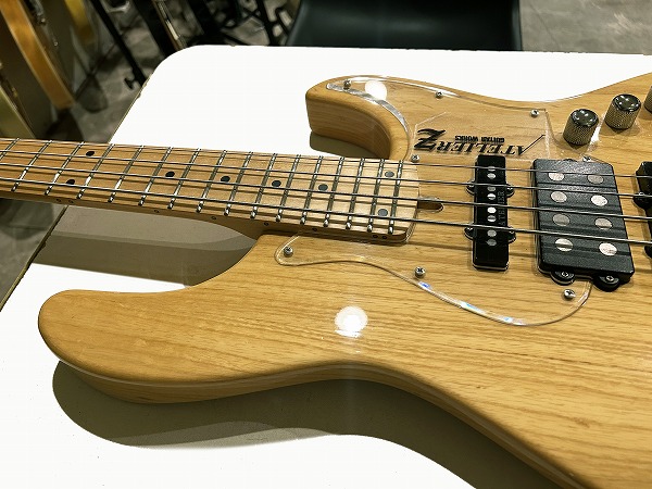 Naturalの1本。パッシブ派のベーシストにも、高品質ATELIER Zのサウンドと演奏性を提供し、価格設定もリーズナブルであったことで高い人気を博したモデルです。現在市場でも安定した人気でプライスも上がっています。アッシュの木目を活かしたナチュラルなルックスとクリアーピックガードのマッチングが同社の名機M245も思わせ、ルックス的にも上質感と存在感ある1本です。