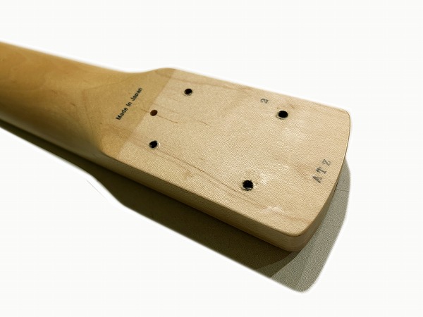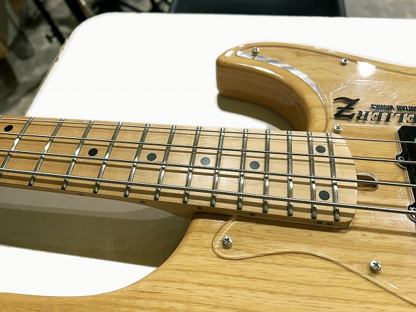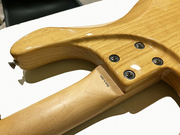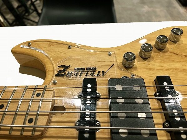 ボディはアッシュで、ディンキーシェイプの深いカッタウェイと、ネックジョイント部は段差がつけられ、ハイポジションも非常に弾きやすく、演奏性の高いモダンシェイプが特徴的です。ネックはメイプルの24フレット仕様、4点止めボルトオンジョイントです。精度・質の高い木工加工と、ジョイントは落とし込みでスペーサーを挟んだビス止めのしっかりとした丁寧な作りなのもさすがATELIER