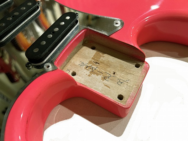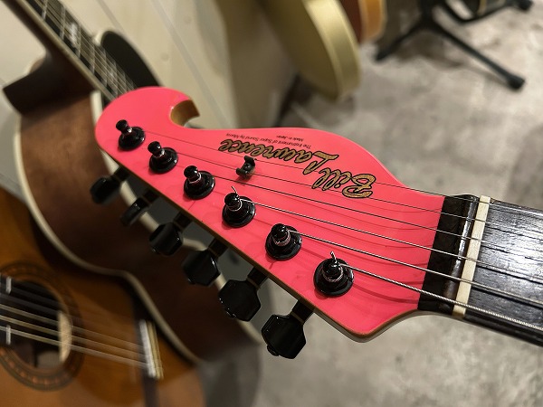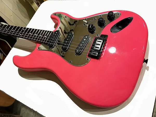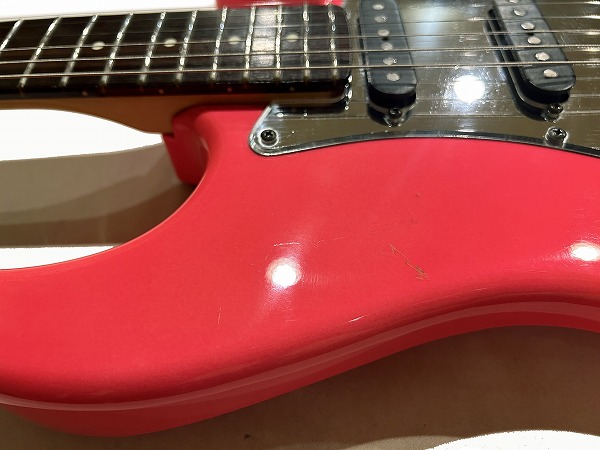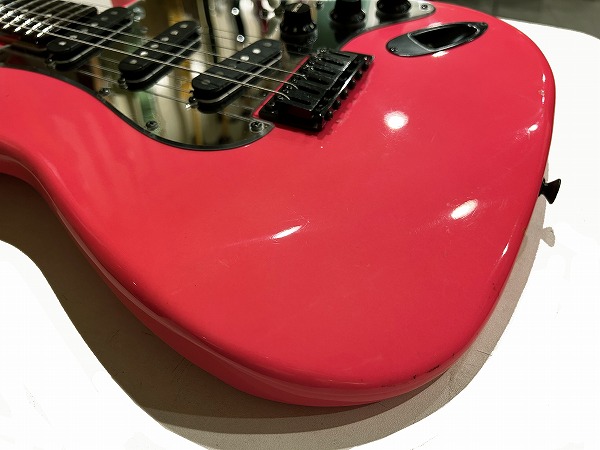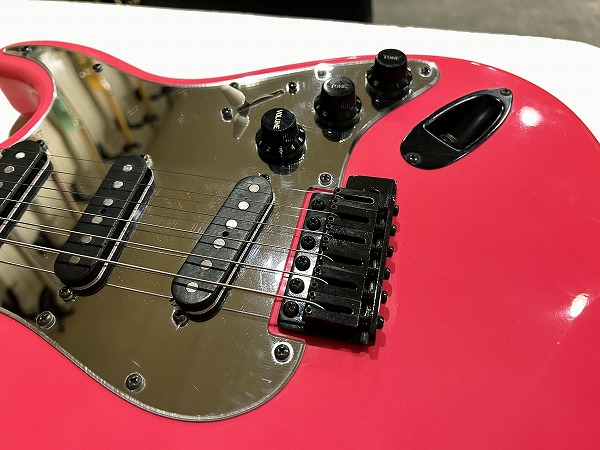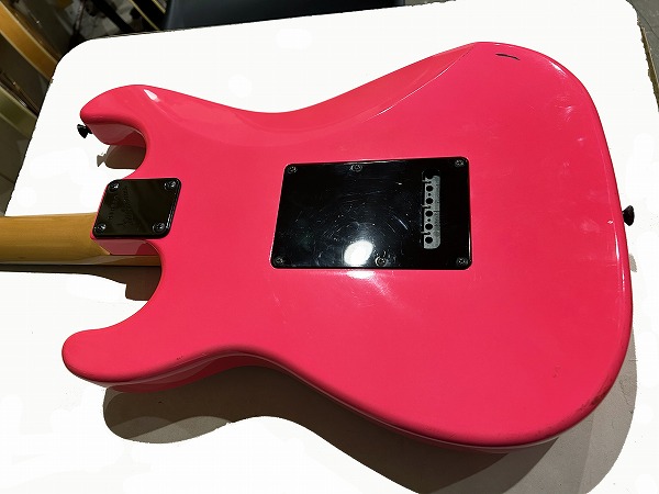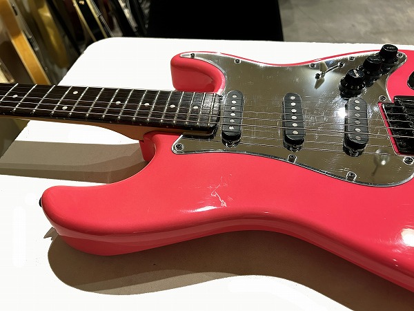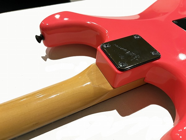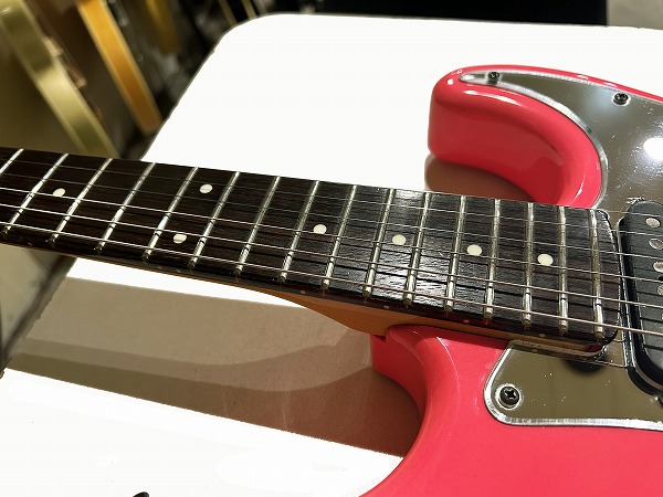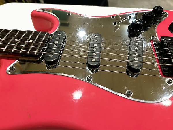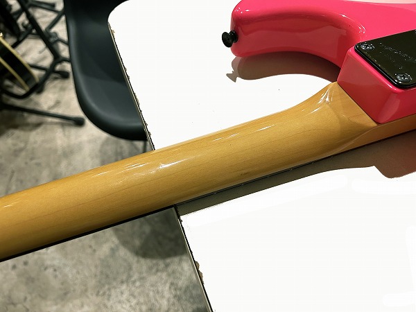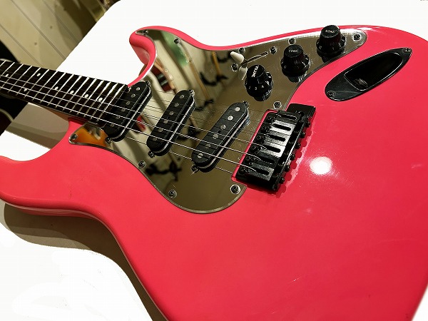 そしてなんと言っても目を惹くこのルックス。ショッキングピンクのボディカラーにマッチングヘッド仕様、ピックガードはミラーミックガードとなっています。ハードウェア、プラパーツはブラックですが、スイッチノブだけホワイトとなっていますので、ここだけおそらく交換されていると思います。ド派手で奇抜ながらポップで可愛いルックスです。