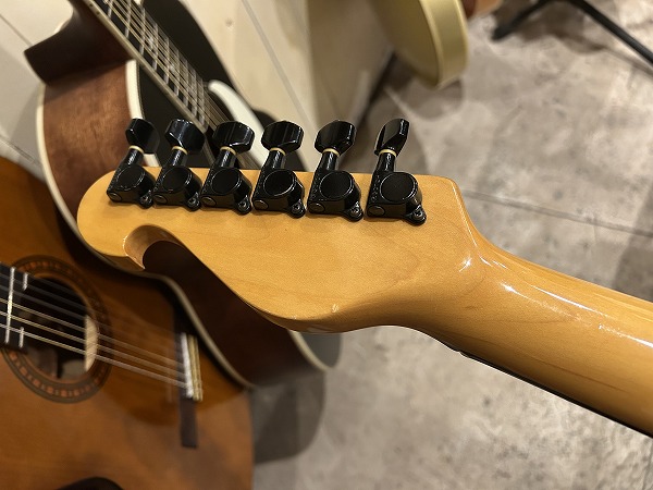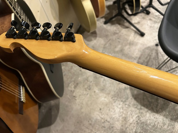 派手なルックスにも目を奪われますが、基本的にはベーシックなストラトスタイルながら、当時のモダンアップデートが施されたモデルで、ストラトスタイルながら630mmのミディアムスケール、指板はかなりフラットめでミディアムジャンボフレット搭載、ナット幅約42mm弱(実測)と細身で、ネックシェイプは薄めのCシェイプを持っているのが大きな特徴です。これによりとても弾きやすく、安定したピッチ、サステインのサウンド、演奏性を実現しています。指板はローズウッドのつば出し22フレット仕様の厚みのあるスラブボードの為、非常にタイトで瑞々しいサウンド、音像なのも特徴的で、個性となっています。ボディはアルダー、ネックはメイプルのローズウッド、6点止めシンクロトレモロタイプブリッジ、ペグはGOTOHのロトマチックタイプです。ピックアップは定評のBill