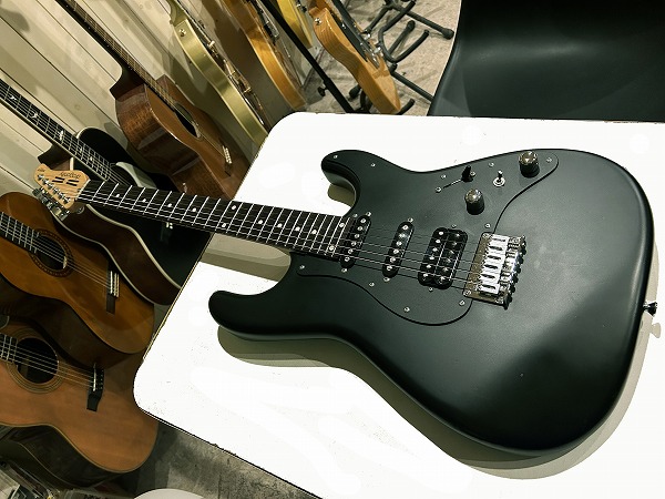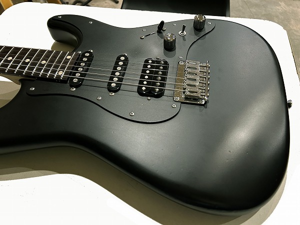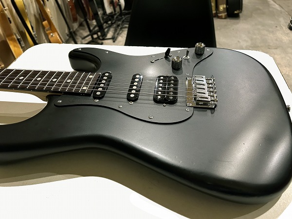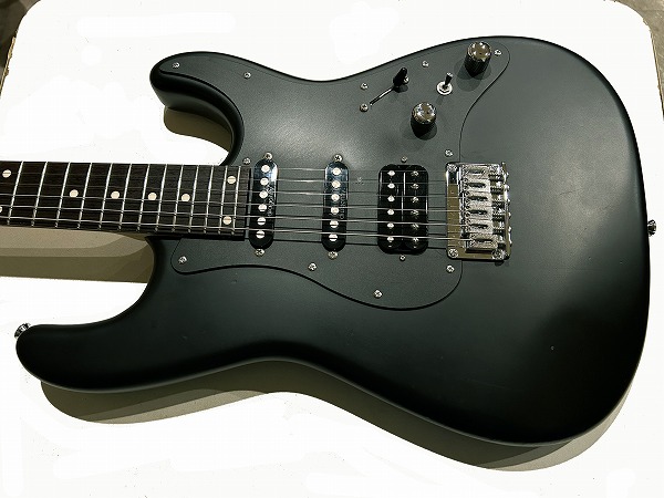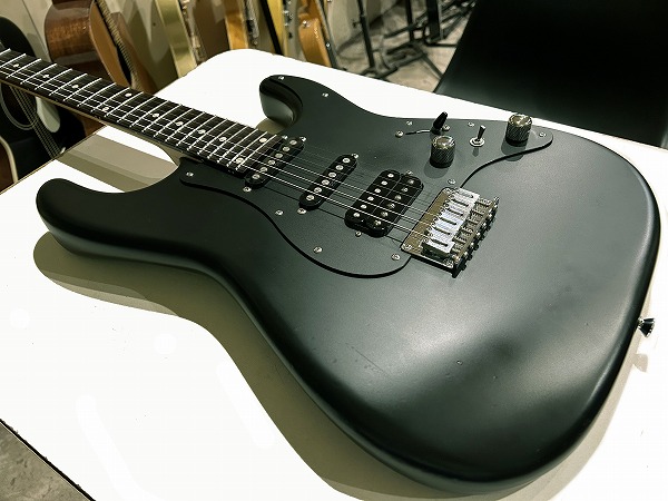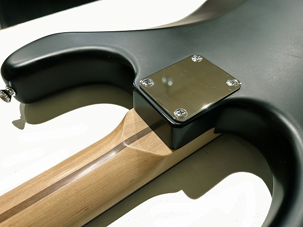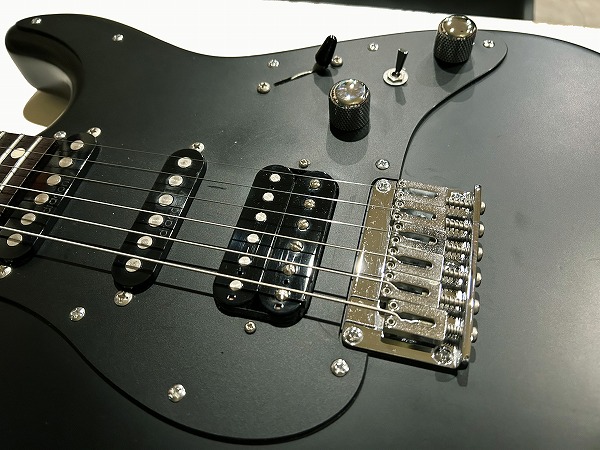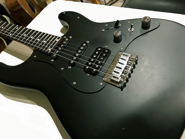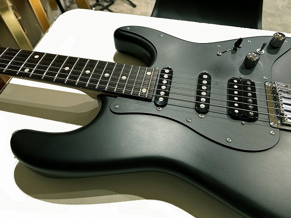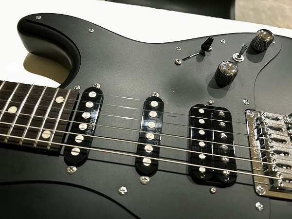こちらのモデルは基本は伝統的なストラトスタイルを持ちながら、一般的なロングスケールよりも長い666mmスケールを持っているのが大きな特徴です。よりスケールを長くすることで、チューニングを下げた時のテンションを保ち、タイトでハリのあるローを確保し、演奏性は通常の6弦ロングスケールと変わらない演奏感です。10-46ゲージでもローB~ノーマルチューニングまで対応し、モダン系、ヘヴィ系スタイルにも対応するモデルとなっています。独自のクライオ処理によるステンレスフレットの搭載も大きな特徴です。硬質で減りが劇的に抑えられ、耐久性が高いのがもちろん、やや硬質で、ブライトなハイトーン、クリアーな音像が魅力です。ボディはアルダーで、塗装はマットブラックでグロスフィニッシュが無い事で塗膜が非常に薄く、抜けの良いサウンドと生鳴りの良さ、ハリと硬さが抑えられた、ソフトな感触があるのも特徴です。抜け良くブリリアントで分離感もありながら、硬すぎず耳に痛くないまとまりのあるトーンです。ネックはメイプルで、指板はパーフェローのつば出し24フレット仕様、スラブボードなのも特徴的です。これにより、粘り感少なくスッキリとした輪郭とタイトさを持ったサウンドとなっており、歪ませた時の音像のタイトさ、クリアーさに貢献しています。ナット幅実測約42mm弱と細身で、やや薄めのCシェイプネック、フラットめの指板と、演奏性スペックもモダンスタイルです。ピックアップも全てオリジナルで、リアはdragonfly