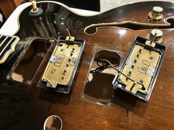 2Tone、1 Toggle SWです。メイプル主体のハリの芯のある明るいトーンに、スプルーストップのアコースティカルなトーンの質感、フルアコの箱鳴り感、ウォームさが加わり、ブリリアントでスイートかつ深い鳴り感のサウンドを奏でます。