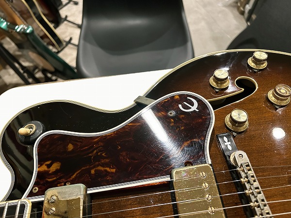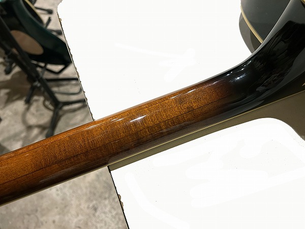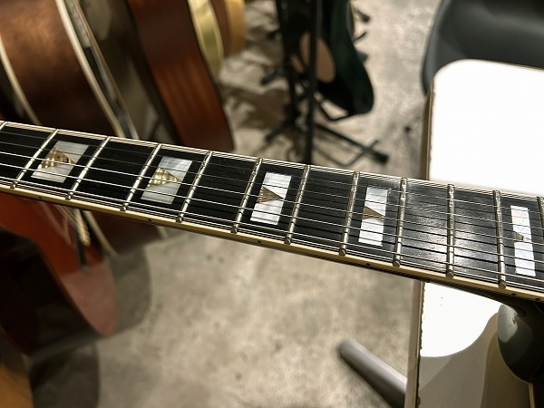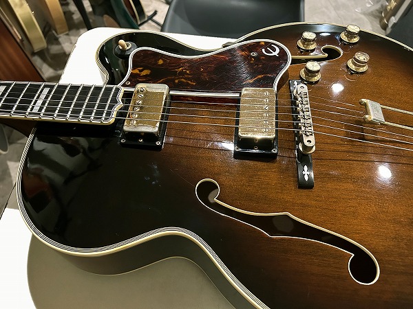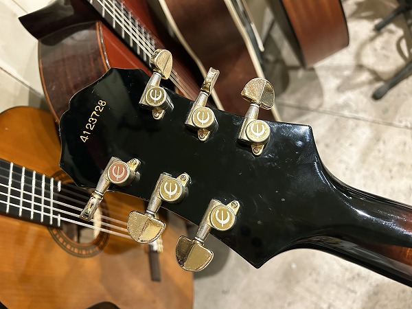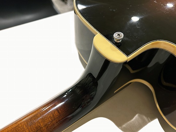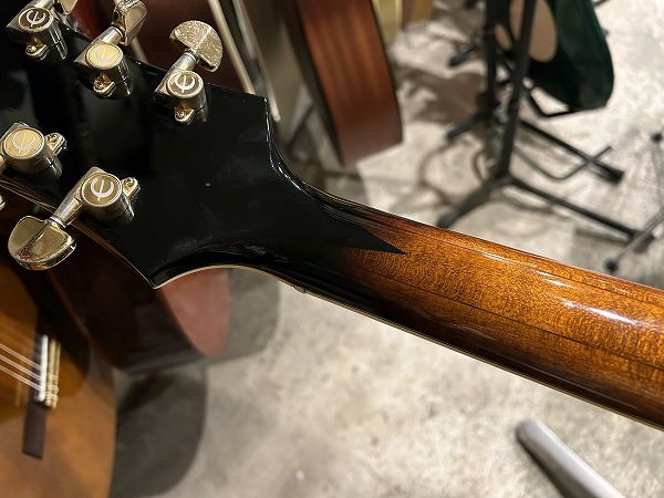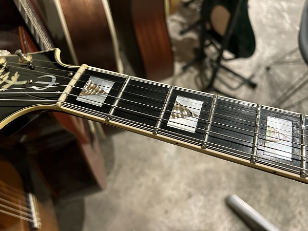 1984年製のEpiphone Japan Emperor です。ボディはスプルーストップにメイプルサイド&バックのフルアコ構造、ネックはメイプル+エボニーの5Pのセットネック仕様で、ネックのメイプルには所々にトラ杢が出ています。指板はエボニーで、ブリッジ台座もエボニー、いずれも当時ならではの良質な木材で、丁寧にしっかりと作られています。指板インレイはブロックタイプで三角のインレイの装飾が施されたVブロック・パール・インレイ、ヘッドロゴは手書き風のヴィンテージライクなタイプとVine