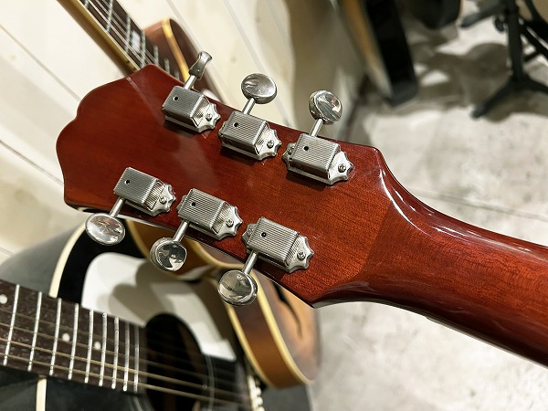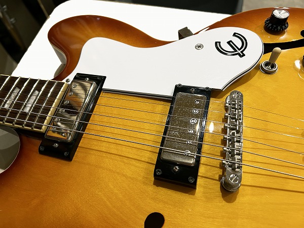1960年代に登場したリヴィエラはルー・リードやオーティス・ラッシュ、ロベン・フォード、ノエル・ギャラガーなどロック、ブルース、多くの世代の数多くのミュージシャンに愛用されてきました。今回入荷したのはそのリヴィエラの現行Epiphoneによるコストパフォーマンスモデルです。ボディはメイプルトップ、サイド&バックもメイプル、メイプル・センターブロックのセミアコ構造ボディに、ネックはマホガニー、指板はインディアン・ローレルとなっています。シンプル・プレーンながらしっかりとしたメイプル、ネックのマホガニーにはややトラ杢も浮き出ています。ジョイントはしっかりとセットネック仕様です。フリークエンセイター・スタイル・トラピース・テイルピース、エピフォンヘッドも特徴的です。そしてもう一つの大きな特徴として、ピックアップはミニハムを搭載しています。コントロールは2Vol