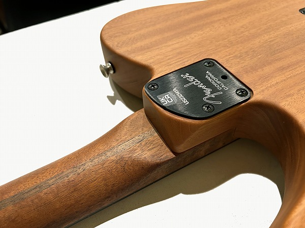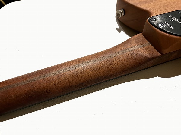 テレキャスタースタイルのボディシェイプ、ヘッドシェイプ、ボディはマホガニー、トップはソリッドマホガニー、ネックもマホガニーのオールマホガニー仕様の1本です。ボディはポリエステル・サテン・マット・フィニッシュ、ネックはサテン・ウレタン・フィニッシュで、さらさらした木の質感の弾き心地も良いです。ネックシェイプはモダンCシェイプで弾きやすさと鳴り感、ファットさを両立しています。指板はエボニーです。テレキャスタースタイルながらボディサウンドホール付きホロウボディを持っており、エアー感のあるアコースティカルな鳴り感、豊かなレゾナンス感、倍音、マホガニーならではのスイートなトーンと中低域も豊かなサウンドながらタイトなサウンド、エボニー指板の瑞々しくクリアーな音像、サテンフィニッシュの鳴りの良さ、抜けの良さと乾いたトーンがあいまって、このモデルならではのアコースティカルサウンドを生み出しています。