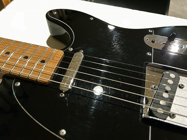 こちらカリフォルニアシリーズのモデルは、USAカリフォルニア工場でボディとネックを製作、研磨と塗装、磨きをメキシコ工場にて行ない、最終組み立てがまたカリフォルニア工場で行なわれたシリーズで、ストラトキャスターとテレキャスターがラインナップされました。1997~1998年のみの製造とかなり短い期間のモデルで知る人ぞ知るモデルかもしれません。カルフォルニアシリーズ・テレキャスターの大きな特徴として、フロントにハムバッカーが搭載出来る様にボディザグリが入っており、フロントハムバッカーの仕様か、フロントにストラトキャスター用シングルコイルの仕様か、2種類のモデルがラインナップされました。特殊なレイアウトだった為か短期間の製造・販売となり、今回入荷した1本もノーマル仕様にカスタムされていますが、本体のポテンシャルも高く、各換装のマッチングが良く、グッドサウンドな1本です。