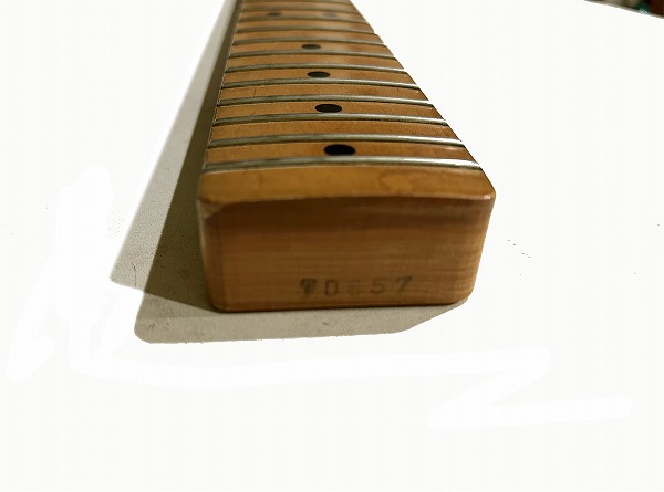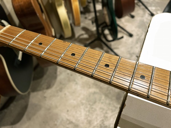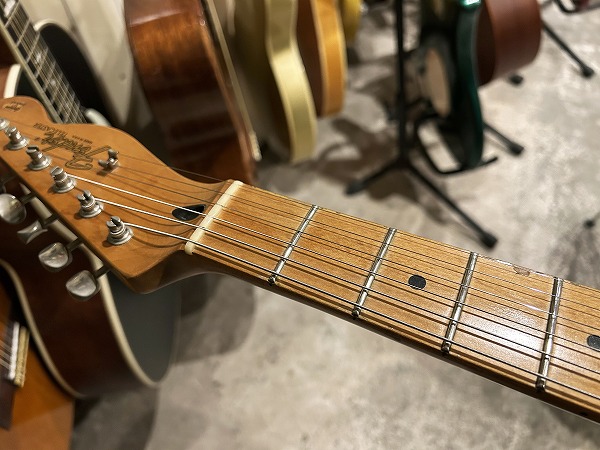 プレイコンディションは良好です。ネックは反りも無く真っ直ぐに調整済です。ロッドはまだ若干の余裕があります。フレットは相応に減りが見られますが、まだ6分~7分程度は残っており、軽度のへこみも見られますが、大きなへこみや弦溝は無く、丁寧に磨きは入れており、大分光沢も取り戻しています。指板も相応に小傷、若干の塗装剥がれ、減り、使用感、使用上の黒ずみなどありますが、使用上の問題は無く、指板も丁寧にクリーニングの上、コンディショニングも行っています。全体的にしっかりとメンテナンス、セットアップを施しており、現在弦高は12フレット上1弦1.2mm、6弦1.5mmとローアクションで弾きやすく、出音も良好です。電装系、コントロール、出音も問題ありません。ピックアップ、ピックガードはオリジナルからは交換されています。(オリジナルは付属しません。)プレイコンディション良好、グッドコンディションです。