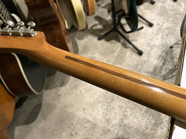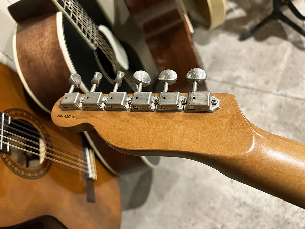 TELECASTERロゴに、ロッド調整口あり、と、ヴィンテージのルックスとフィーリングはしっかり継承し損なわないまま、当時のアップデートもされている仕様です。ネックの塗装も薄く、生鳴り感、響き良く、乾いた抜けの良さのヴィンテージライクなトーンを持ちながら、ミディアムジャンボフレットは音程感やベンド感も良く、サステインも伸びやか、演奏性や弾き心地も良いです。