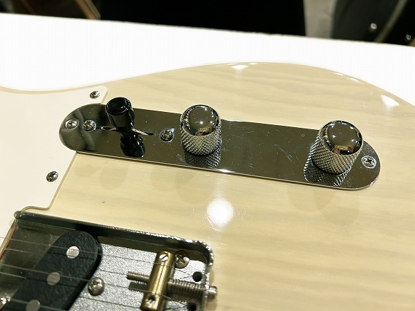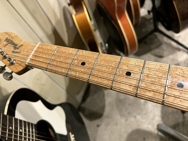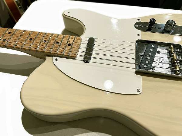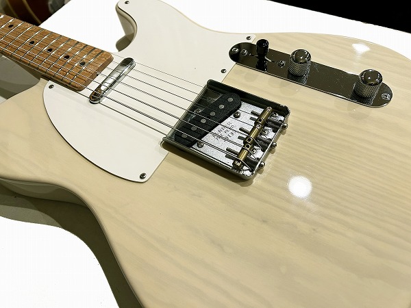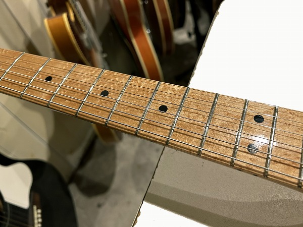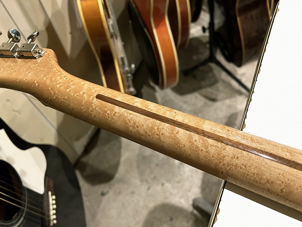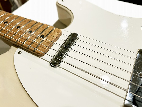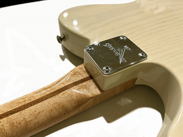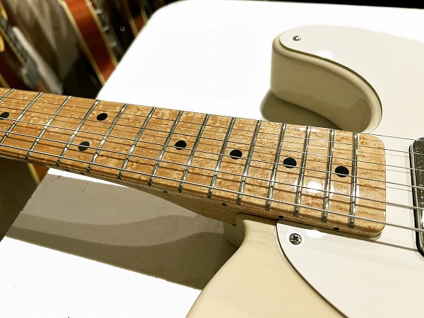 ボディは極上杢目のアッシュ2Pで、シースルーホワイトのカラーから綺麗な杢目が浮かび上がっており、とても格好良いルックスです。そして何と言っても目を惹くのが、この激バーズアイメイプルネック。指板面、ネック裏、ヘッドまで全面にビッシリとバーズアイが浮かび上がっており、その存在感と極上感は別格です。ブリッジはブラスの3サドルタイプ、ペグはクルーソンタイプ、ピックガードはホワイトの1プライで、1950's