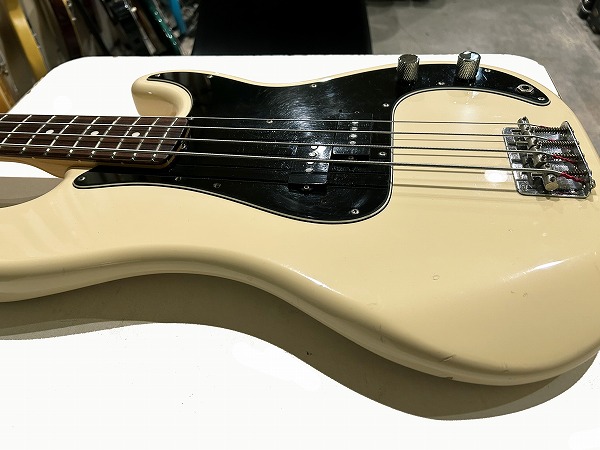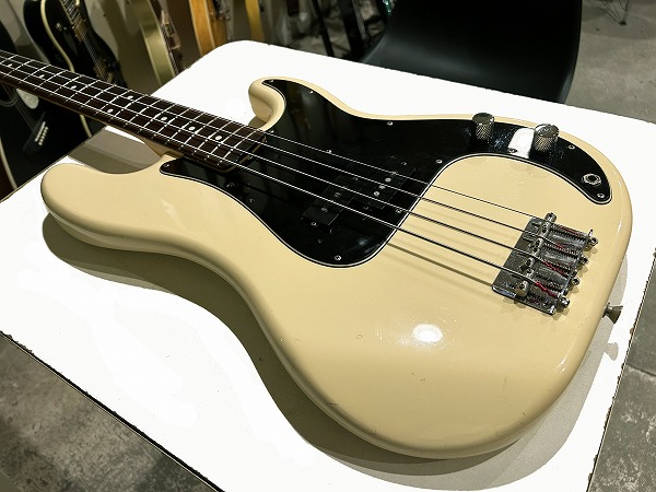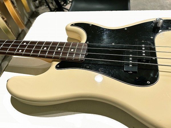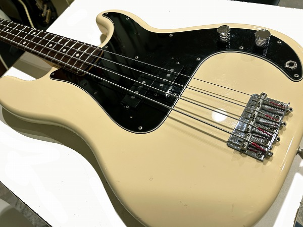 ボディはアルダー、ネックはメイプル+ローズウッド、Fender ブラックロゴにPRECISION BASSロゴ、オフホワイトにブラックの3ピースピックガードという70s