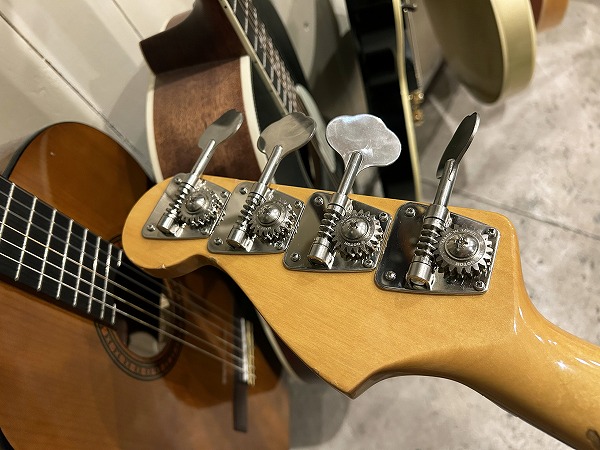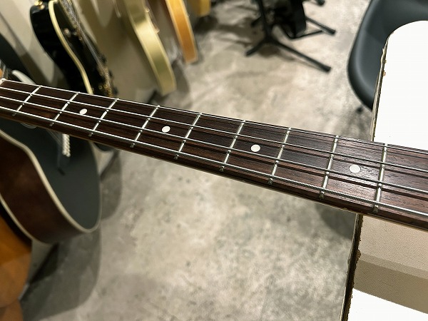 スタイルの仕様を持ったクールなルックスのモデルです。ナット幅は実測約39mm強と細身で、シェイプはCシェイプ、プレベながら比較的細身のネックは弾きやすいです。ピックアップはUS製のプレベタイプを使用し、コントロールは1Vol