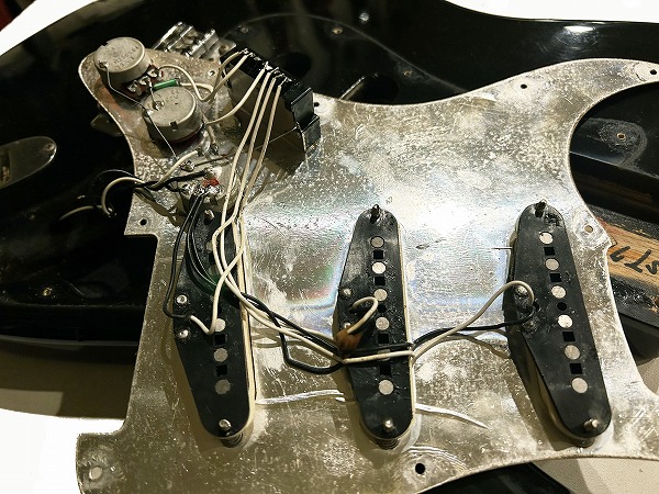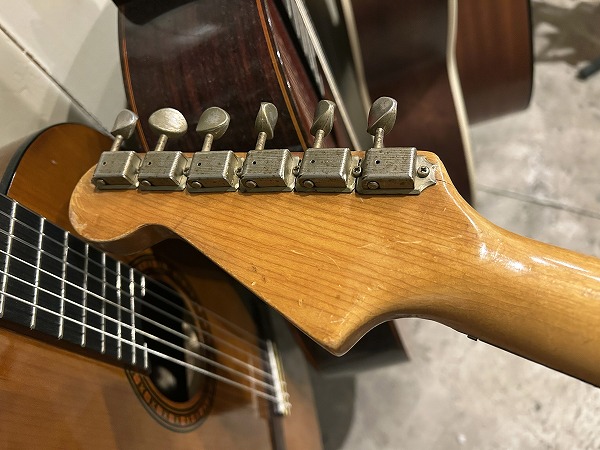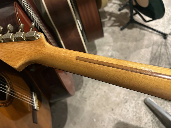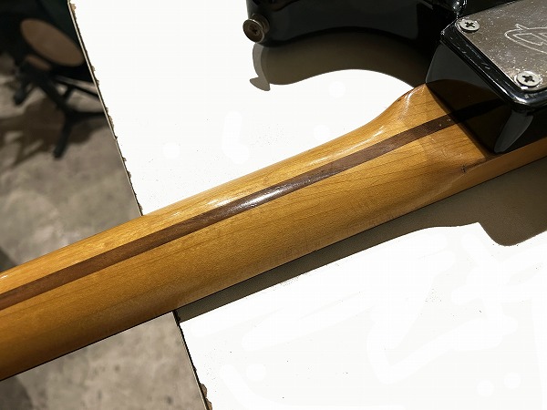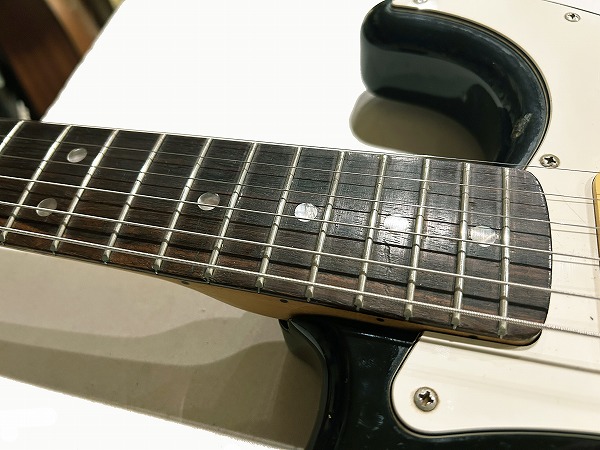 まずネックはまだロッドは若干の余裕があり、おおむね真っ直ぐな状態に調整済みですが、指板に減り、へこみ傷、打痕がやや多いです。使用上大きな問題はありません。フレットも相応に減りがあり、7分程度の残りとなっていますが、大きなへこみや弦溝はありません。ナットは交換されており、現在ブラスナットが載っていますが、接着されておらず、高さ調整もきっちりとは行なわれていません。現在1弦側にシムをかませ、簡易的に高さ調整は行なっております。ネックとボディの高さのマッチングもあまり良くない為、やや弦高が高め、低音ハイポジションにビビリが出やすい箇所があります。現在12フレット上1弦2mm、6弦2.5mmとなっています。現状で出来る限りのベストセッティングは行なっており、大きなビビリやデッドポジションは無く、とりあえず使う事は出来ますが、あくまでとりあえずのセッティングとお考え下さい。また、ペグは交換されており、元のビス穴が残っているほか、6弦ペグ付け根に木部クラックも見られます。現状使用に大きな問題はありませんが、要修理箇所となります。電装系は大きな問題は無く、出音・コントロールも良好ですが、ピックアップカバーの色が異なる為、交換されている可能性があります。背面の配線やパーツを見ると、Fender