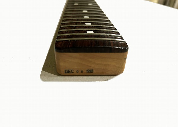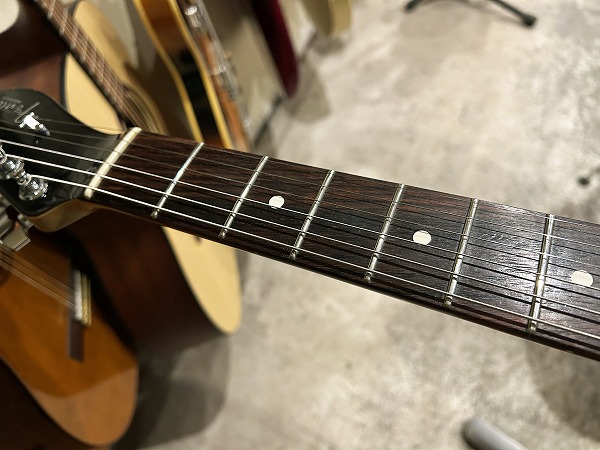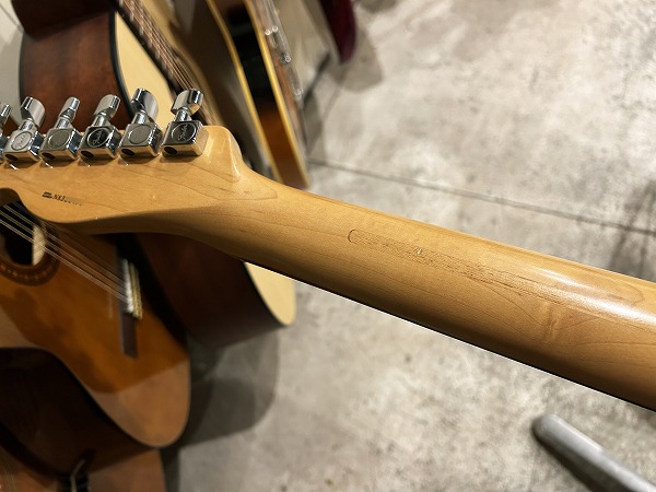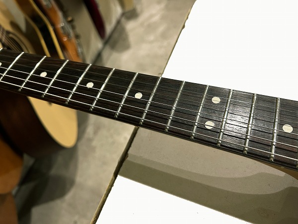 プレイコンディションは良好です。ネックは真っ直ぐに調整済で良好な状態です。ロッドはまだ若干の余裕があります。フレットも相応に減り、軽度のへこみも見られますが、まだ7分程度は残っており、ローアクションセッティングで出音も良好です。丁寧に磨きも入れており、大分光沢も取り戻しています。指板も若干の使用感、小傷はありますが、大きな減りやダメージは無く、こちらも丁寧にクリーニング、コンディショニングを行なっています。マイクロティルト機能も問題無く、ネック角調整、ブリッジ調整など各種メンテナンス、セッティング済で、弦高ローアクションで出音良好です。現在弦高は12フレット上1弦1.2mm、6弦1.5mmで、弾きやすく出音良好です。電装系も出音、コントロール共に問題ありません。良好なプレイコンディションです。