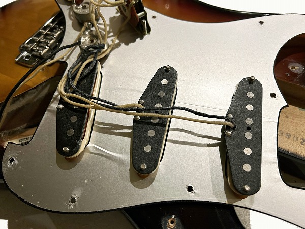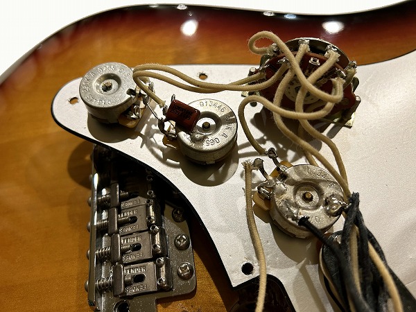 スラブ・ヴィンストならではのサウンド、グッドサウンドな1本です。コントロールは1Vol、2Tone、3Way Lever Switchとなっています。ピックガードは交換されており、現在3プライのべっ甲タイプが付いています。(オリジナルのピックガードは付属しません。)ピックガード裏面は全面アルミシールドが施され、ポットはCTSスイッチもUSAパーツ、電装関係もクオリティの高いパーツ、仕上がりです。ブリッジは6点止めシンクロナイズドで、ブリッジサドルはFender刻印入りのヴィンテージタイプ・サドル、ペグはクルーソンタイプです。