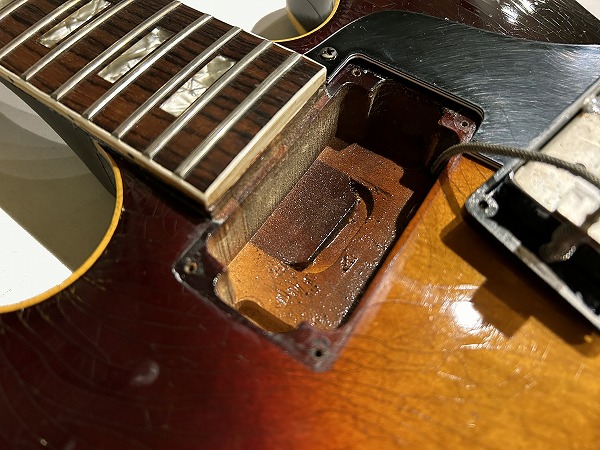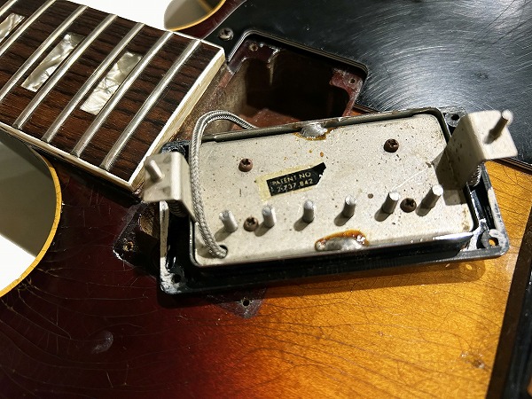 ピックアップはオリジナルの、ステッカード・ナンバード・PAF。こちらは様々なヴィンテージリイシューの元となった歴史的ピックアップで、単体でも非常に高い人気と市場価値を誇るモデルでもあります。ピックアップ背面ステッカーには少し剥がれはあるもののステッカーも残っています。さらにポット、スイッチなど電装系も全てオリジナルのまま。CTS