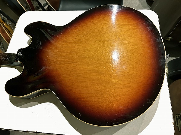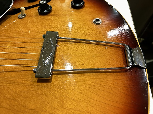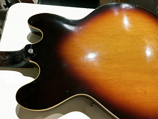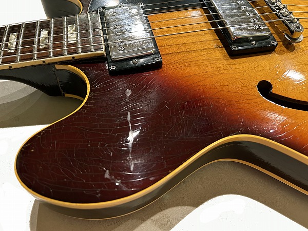 サウンドの方も極上のヴィンテージ335サウンドです。ほどよい出力感のいなたさとしっとりとまとまりのある、こなれた枯れたトーン、乾いたドライな質感のトーンは、リアルヴィンテージならではの味わい、色気のある極上トーンです。セミアコ構造のほどよくふくよかなウォームな箱鳴り感と、メイプルのはっきりとした芯のあるタイトさを持ったサウンド、マホガニー1Pネックのスイートさとタイトさ、経年し乾燥した木材と極薄のラッカー塗装ならではの抜けの良さと響き、全てがマッチし、スイートでまろやかながら、カランとしたドライさと艶やかで色気のあるトーンを持った、さすがは67年オリジナル335ならではの極上ヴィンテージ335サウンドとなっています。クリーンでもクランチでも極上のテイストのトーンが味わえ、いつまでも弾いていたくなる素晴らしいヴィンテージ335サウンドです。このまろやかさ、色気とスイートなタイトさ、ドライな抜け感は、どんなハイグレードモデルでも現行モデルに出せないサウンドです。