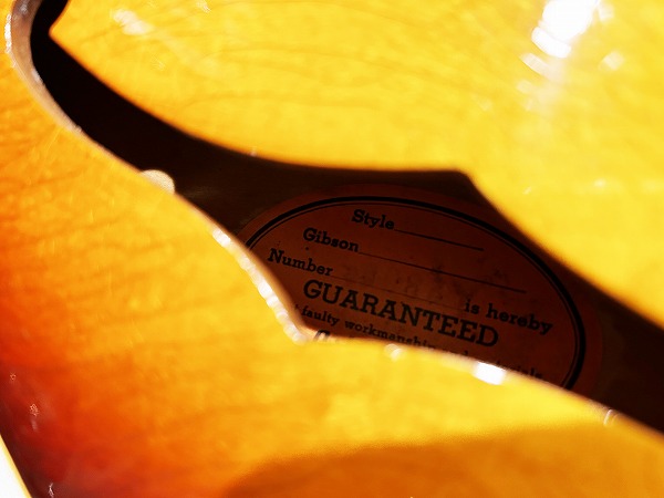 パーツ変更点はナットとおそらくペグのみで、基本的にはオリジナルコンディション、グッドコンディションの極上の1本です。ボディはメイプルで、所々にいくつかバーズアイのような木目も見られ、とても良質な材が使用されています。センターブロック入りのセミアコホロウ構造、ネックは人気の高いスペックとなる、ボリュート無しのマホガニー1Pネックで、マホガニーもとても綺麗な木目の非常に上質なマホガニーです。ネックはこちらも人気の高いナローネック仕様で、ナット幅40mmの細身で非常に弾きやすいネックです。ジョイントはディープジョイント仕様です。ヘッド裏刻印シリアルナンバーは「300***」の6桁シリアル、ラベルの印字も薄くはなっていますが同シリアルです。指板はローズウッドでこちらも木目も色味も綺麗な非常に上質なローズウッド、ポジションマークはスモール・ブロック・インレイです。いずれもヴィンテージ335の中でも特に高い人気を誇るスペックです。ブリッジはABR-1ブリッジ+トラピーズ・テイルピース、ペグはおそらく交換されており、1コブのグリーンキーのクルーソンタイプです。年式等は不明ですが、ルックス的マッチングはバッチリです。人気の60年代335スペックが揃い踏みの仕様です。