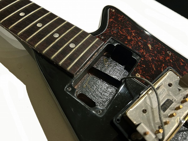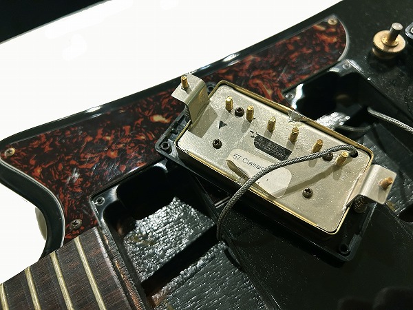 IN USA 2012の刻印が入っています。エボニーカラーにゴールドハードウェア、べっ甲柄のピックガードのルックスも精悍かつゴージャスかつクールでとても格好良いです。