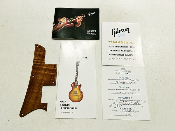 外観的にもまだまだ綺麗なコンディションを保っています。ボディエンド、バック、エッジ部に小さな米粒大塗装剥がれが数か所見られる他、全体的に小傷、擦り傷、金属パーツのくすみ、退色など若干の使用感、経年感はありますが、目立った大きなダメージは無く、まだまだ綺麗なグッドコンディションです。全体的に丁寧にクリーニング、磨きも行なっており、綺麗なコンディションになっております。ケースは純正ハードケースが付属します。また、前オーナー様が別途オーダー製作されたと思われる木製ピックガードが付属します。