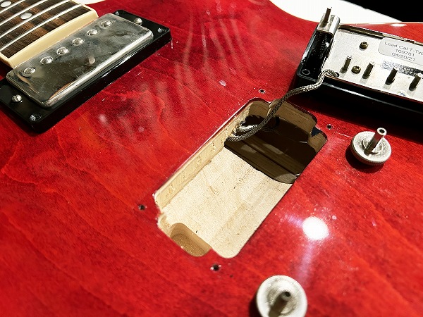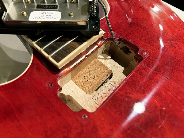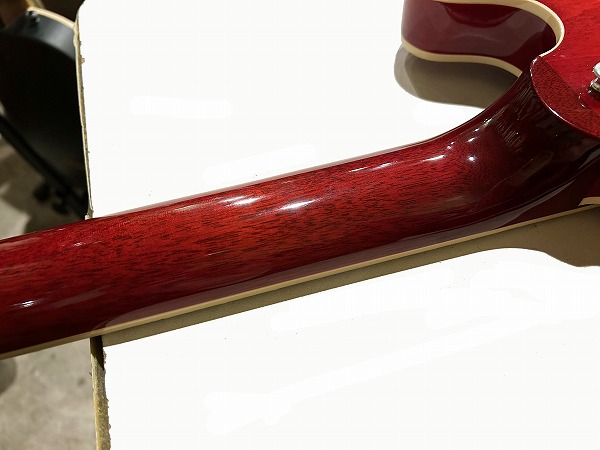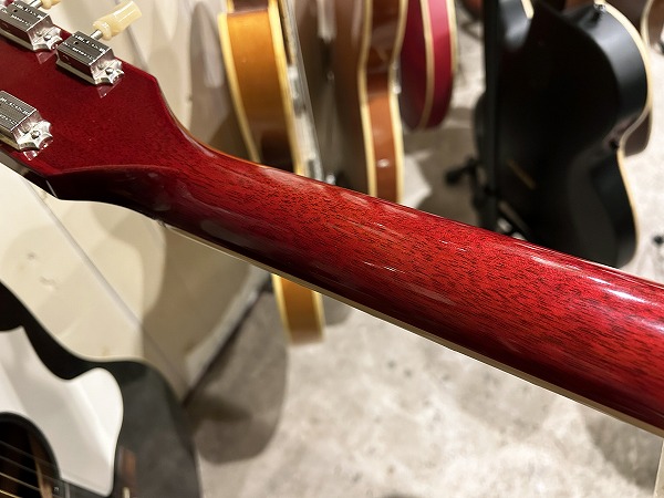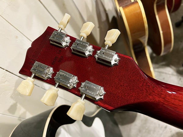 ボディはトップ、バック共にメイプル+ポプラ+メイプルの3プライで、メイプルはシンプルながら美しい木目のプレーンメイプルで、深みのあるシックスティーズ・チェリーのシースルーレッドとあいまって、質感高く本格的なルックスでとても美しく格好良いです。ネックはマホガニーのセットネック、ネックシェイプはラウンドのCシェイプで、ややしっかりめのシェイプで、グリップ感とファットな鳴りを確保、指板はローズウッド、ポジションマークはパーロイド・ドット・インレイです。ネックはバインディング付きエッジドバインディングで、サイドは角が落とされたハンドロール処理も行なわれており、弾き心地も滑らかです。ブリッジはABR-1、軽量アルミニウムのストップバー・テイルピース、ペグはキーストーンのヴィンテージ・クルーソン・デラックスタイプで、安定したチューニング、音程感、ヴィンテージライクなルックスの全てを確保しています。