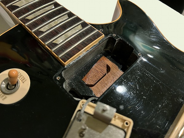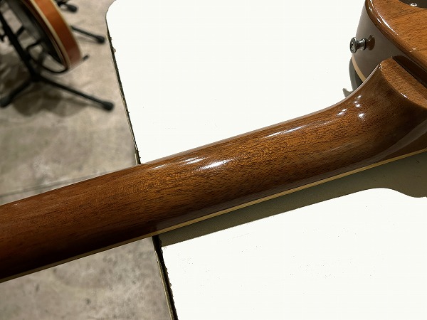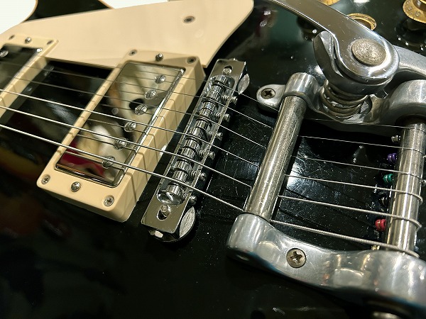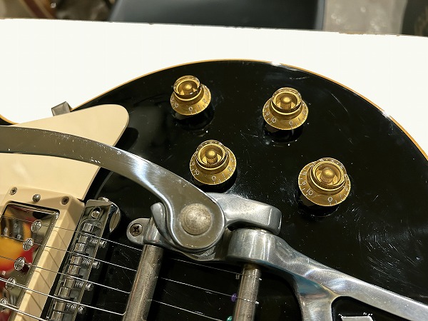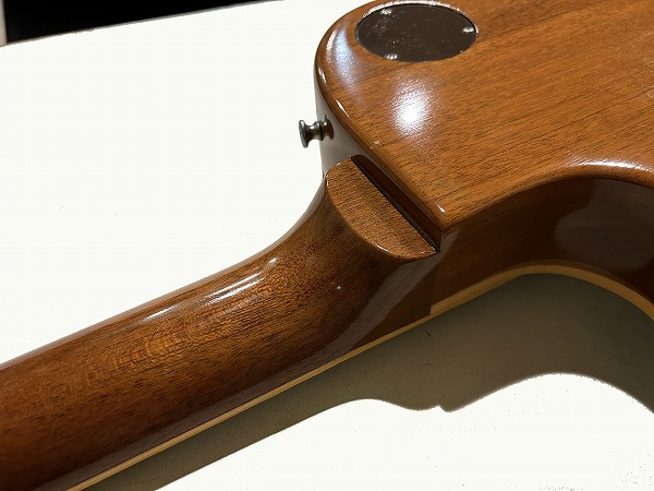 ボディはメイプルトップ+マホガニー1P、ネックもマホガニーのセットネック、ディープジョイント仕様です。カラーはオリジナルではオールブラックでしたが、バック、サイド、ネック裏は塗装剥がし、クリアーでラッカーリフィニッシュされています。木目を見ていただいても分かるように、元々塗りつぶしモデルでも、しっかりと上質のマホガニーが使用されておりさすがはカスタムショップ製です。ヘッド裏の刻印シリアルナンバーは残されており、シリアルナンバー周りは少し黒のカラーが残っています。リフィニッシュは前オーナーが専門ギター工房に依頼し、丁寧に仕上げられています。指板はローズウッドで、指板も色味、導線の入り方も綺麗でさすが上質なものが使用されています。ナット幅約43mm、ネックシェイプはやや太めのラウンドタイプで、非常にファットなサウンドと鳴りの良さを持っています。重量は4.61kg(デジタルはかり計測)と少々重いですが、それゆえの鳴りの良さ、ダイレクトなマホガニーのスイートな音色の質感、かつタイトで瑞々しくクリアーなサウンドとなっています。さらにカスタム点として、ブリッジはGretschのローラーブリッジに交換されており、Bigsby