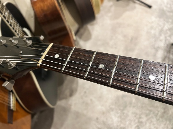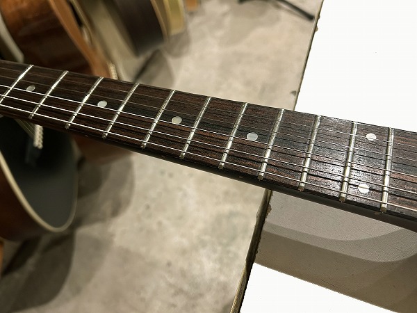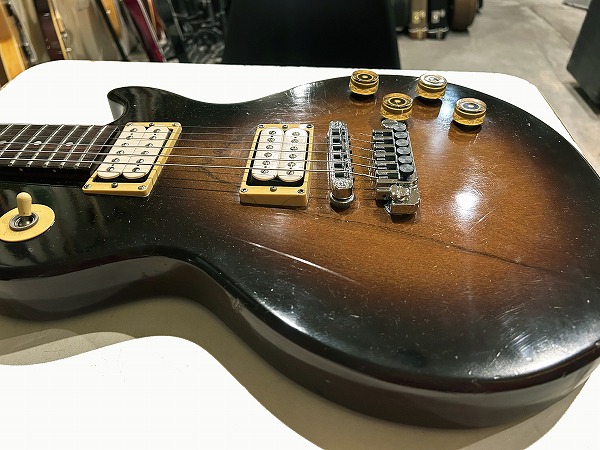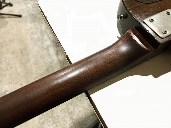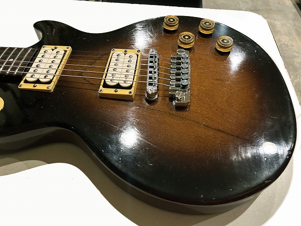 プレイコンディションは良好です。ネックは真っ直ぐに調整済で、ロッドもまだ若干の余裕があります。フレットは相応に減りは見られ5分程度の残りとなっており、山はかなり低くなっていますが、大きなへこみや弦溝はありません。ローアクションセッティングで出音も良好です。丁寧に磨きも入れ、光沢のある綺麗なコンディションになっています。指板も相応に使用感、軽度の減りや小傷は見られますが、大きな減りやダメージは無く、指板も丁寧にクリーニング、コンディショニングを行なっており、綺麗な状態になっております。各種メンテナンス、セッティング済で、弦高ローアクションで出音良好なグッドプレイコンディションとなっています。現在弦高は12フレット上1弦1.5mm、6弦1.5mmで、弾きやすく出音良好です。電装系も出音、コントロール共に問題ありません。ピックアップ一度交換されているものと思われ、配線し直しされています。現在は普通のハム配線になっており、コントロールは2Vol