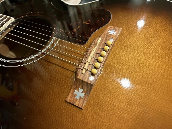 Historic Collection、当時のリイシューモデルで、J-185の仕様と魅力が再現された素晴らしい1本です。ボディはトップはシトカスプルース単板、サイド&バックはトラ杢の浮き出たフレイムメイプル単板といずれも良質な木材が使用されています。ボディは16インチのディープボディで、J-200よりは小型とはいえ、やはり深い胴鳴りと豊かなサウンドが魅力で、かつメイプルならではのはっきりとしたクリアーな芯のあるトーン、シトカスプルーストップのアコースティカルで繊細さもありながら明瞭なトーンで、深くクリアーな鳴りの印象のサウンドです。ネックはマホガニーでローズウッド指板、ネックバインディング付です。ペグはクルーソンのグリーンキーです。サンバーストカラーやシェイプ、デザインと相まってヴィンテージライクな本格的なルックスも素晴らしいです。深い鳴りと明瞭なトーンは、つま弾くにも弾き語りにも最高です。