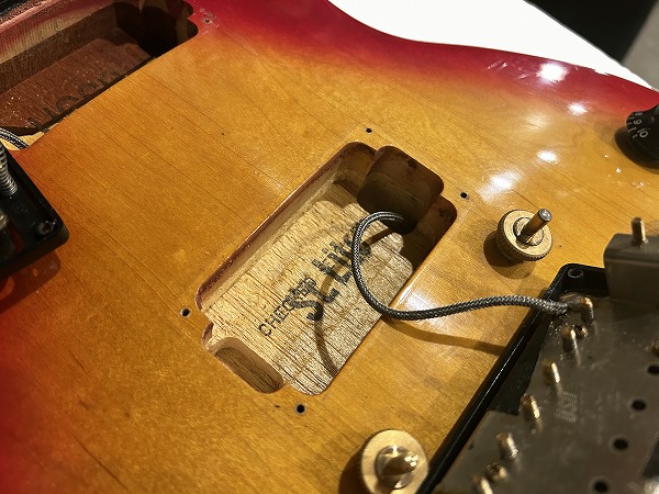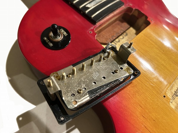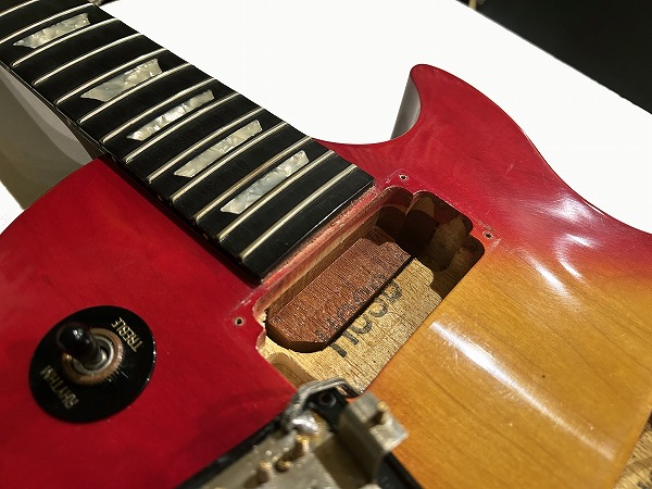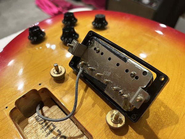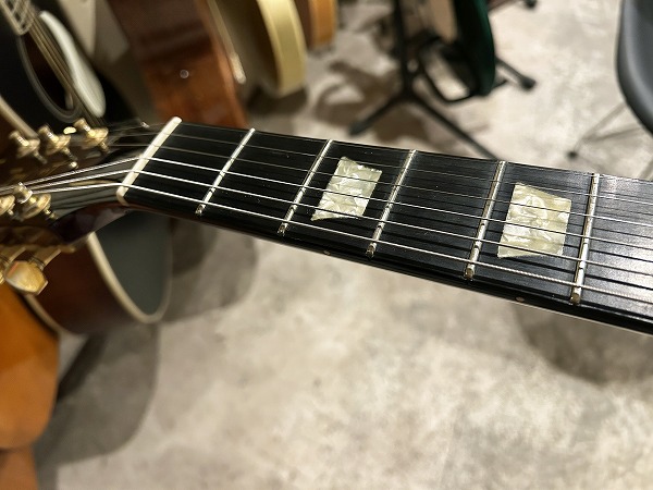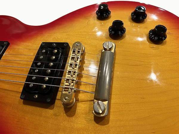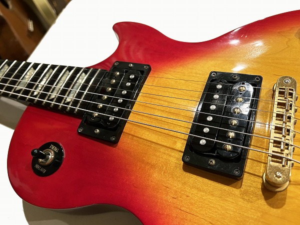 ルックスも個性的です。王道チェリーサンバーストカラーですが、バインディング無し、ピックガード無しでオープンブラックのハムバッカーに、黒味のあるエボニー指板、ゴールドハードウェアのルックス。クラシカルながらモダンさとゴージャスさを持った独特のルックスです。