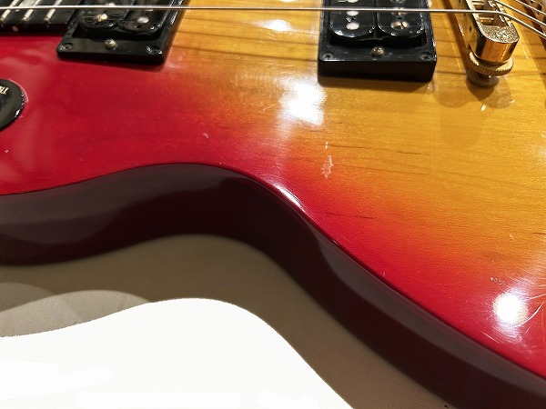 外観的にも相応に傷、使用感、経年感があり、打痕や擦り傷、若干の小さな塗装剥がれ、塗装の経年変化でザラつきの出ている箇所、金属パーツのくすみなど、全体的に相応に多々あります。ひどく大きなダメージはありませんが、相応のプレイヤーズコンディションの1本で、ルックスの雰囲気の良さはあります。全体的に丁寧にクリーニング、磨きも入れており、綺麗なコンディションになっております。ケースは純正ハードケースが付属します。