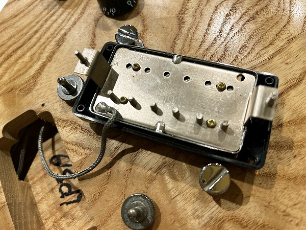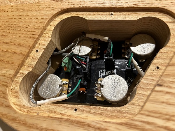 まず目を惹くのはやはりトップのくっきりと杢目の浮き出たスワンプアッシュです。バックもスワンプアッシュで、バックは3P、トップはセンター2Pといった仕様です。ネックはマホガニーのセットネック仕様、指板はローズウッドです。フィニッシュはサテンフィニッシュとなっており、木の質感のサラッとした弾き心地の良さや、生鳴りの良さ、抜けの良さは魅力です。重量も3.42kg(デジタルはかり実測)と軽量機です。ウッドの杢目のナチュラルなルックスにピックガード無し、クロームのハードウェア、ブラックのエスカッションやパーツもシンプルかつ精悍で格好良いです。ブリッジはチューン・オー・マチック+ストップテイルピースタイプ、ペグはクルーソンのグリーンキータイプでクラシカルなテイストも感じさせます。ピックアップはカタログスペックが分からない為正確には不明ですが、背面にGibsonロゴ入りでオリジナルのまま、490Rと498Tと思われます。コントロールは2Vol、2Tone、3Way