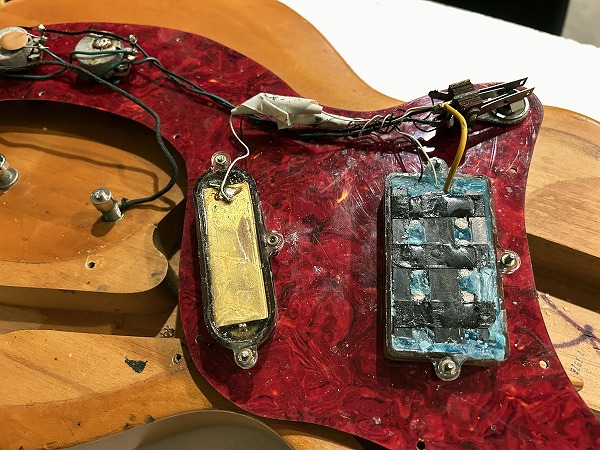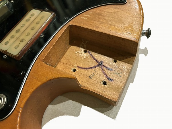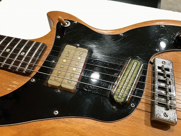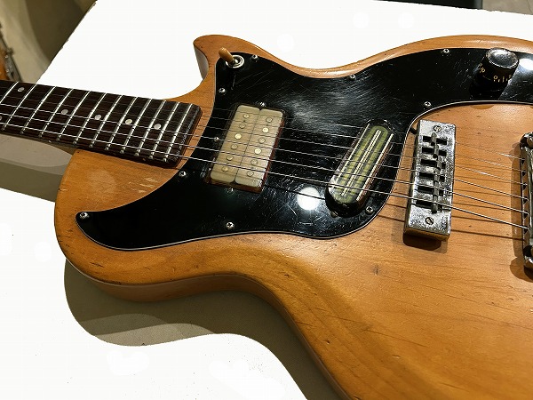 Gibson Marauderは1975年に発表され、約5年間の短期間の販売で生産数もわずか6400台ほどと言われています。短命に終わったモデルですが、その他に無い仕様と存在感は現在では時代の大きな魅力を感じさせます。今回入荷したのは1975年製の1本で、ヘッド裏刻印シリアル「57****」、ボディのネックジョイント部に「1975(最後の5がやや判別しづらいです)」のスタンプがあり、各部仕様とも併せて判断し、1975年製の1本です。ボディはレス・ポールシェイプのメイプルボディに、ネックもメイプルのローズウッド指板、ネックジョイントはGibsonの歴史の中でも少ないボルトオンジョイント仕様なのが特徴的です。ヘッドシェイプはフライングVヘッドシェイプとなっており、レス・ポールシェイプのボディ、特徴的なピックガードデザインとあいまって、個性的かつとても格好良いルックスの1本です。ロッドカバーにはMARAUNDERのデザインロゴが入っています。ピックアップも非常に特徴的で、プラのクリアーケースに収められたリアシングル、フロントハムのレイアウトで、そのサウンドはもちろん、こちらもルックス的にもその個性を高めています。コントロールは1Vol、1Tone、1Toggle