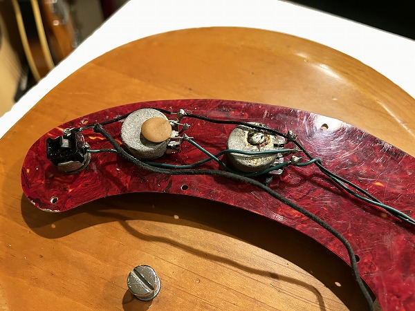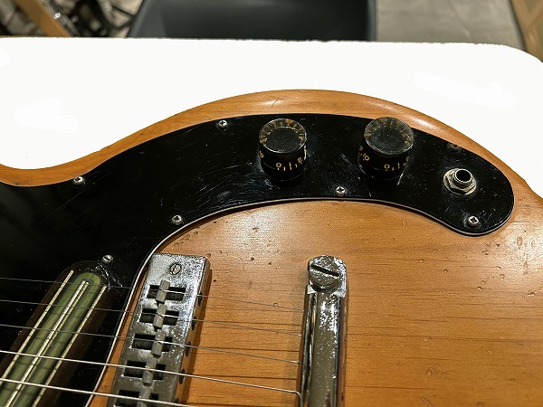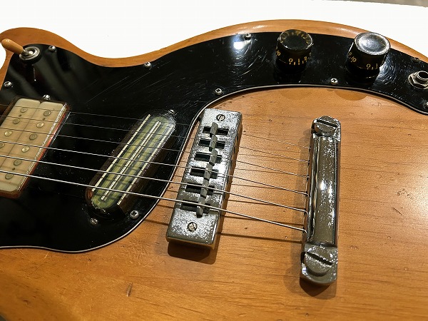 SW(ピックアップセレクター)です。ブリッジはワイド・チューン・オー・マチックタイプにストップテイルピース、ペグのみ交換されており、クルーソンのグリーンキータイプが現在搭載されています。こちらオリジナルではありませんが、ルックス的にはよりヴィンテージライクな雰囲気です。