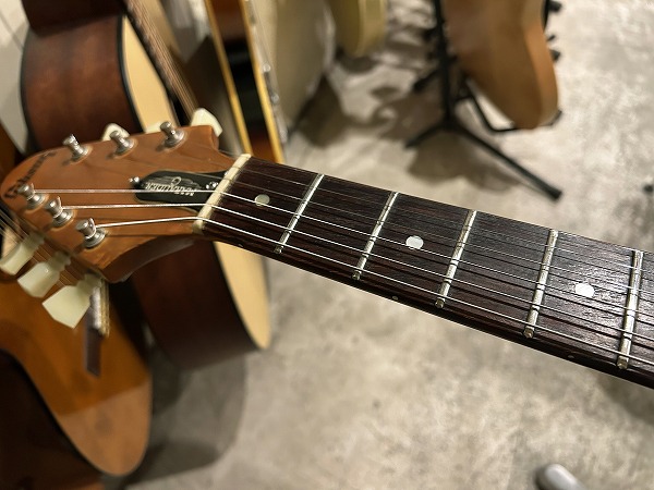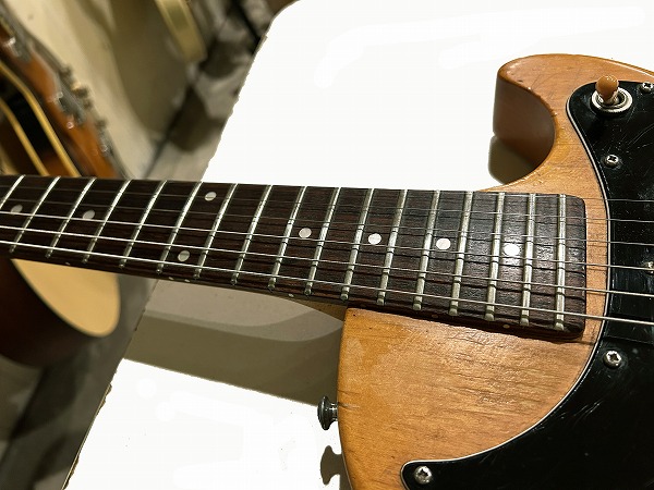 プレイコンディションは良好です。ネックは真っ直ぐで良好、フレットは相応に摩耗点や使用感もありますが、弦高ローアクションセッティング済で弾きやすく、出音も良好です。電装系も出音、コントロール共に問題ありません。外観的には相応に多数の打痕、表面の擦れ、傷、使用感、経年感がある相応のプレイヤーズ・ヴィンテージ・コンディションですが、ナチュラルなレリック感のある雰囲気は抜群です。ヘッド裏6弦側のナット横に、おそらく接着剤のはみ出しによる接着剤跡がありますが、使用上は特に問題ありません。前述の様にペグは交換されています。また、ピックガードやロッドカバーの取付ビス、スイッチノブも交換されているものと思われます。傷、使用感、経年感は多数ありますが、全体的に丁寧にクリーニング、磨きも入れており、綺麗なコンディションになっております。ケースは当時付属品かどうか不明ですが、70sのGibson