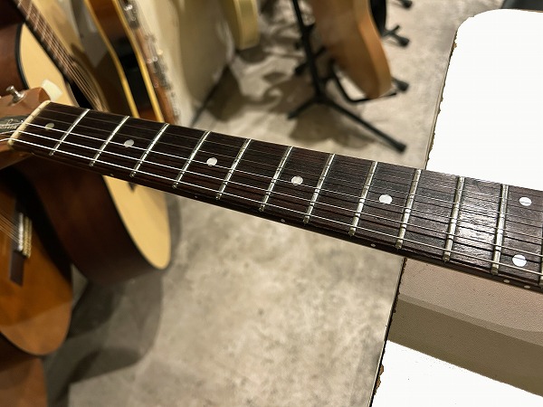 プレイコンディションは良好です。ネックは真っ直ぐに調整済で、ロッドは若干の余裕があります。フレットは相応に減りは見られ5分程度の残りとなっており、山は低くなっていますが、大きなへこみや弦溝はありません。ローアクションセッティングで出音も良好です。丁寧に磨きも入れ、光沢のある綺麗なコンディションになっています。指板も相応に使用感、若干の減りや小傷は相応に見られますが、大きな減りやダメージは無く、指板も丁寧にクリーニング、コンディショニングを行なっており、綺麗な状態になっております。現在弦高は12フレット上1弦1.2mm、6弦1.5mmで、弾きやすく出音良好です。電装系も出音、コントロール共に問題ありません。前述の様にペグは交換されていますが、動作、使用上共に良好で問題ありません。各種メンテナンス、セッティング済で出音、演奏性良好、そのまますぐにお使いいただける、グッドプレイコンディションです。