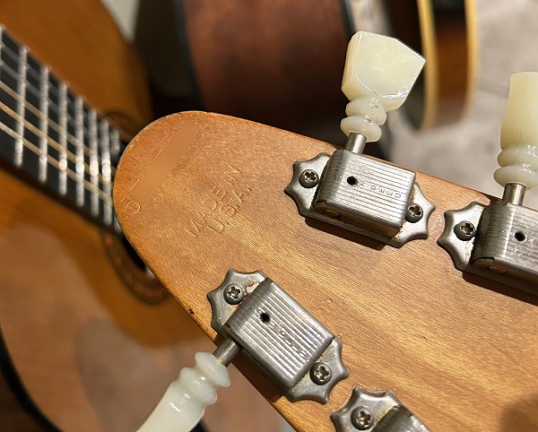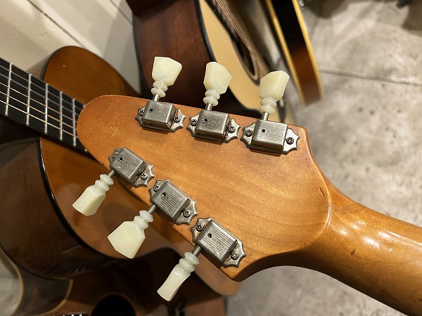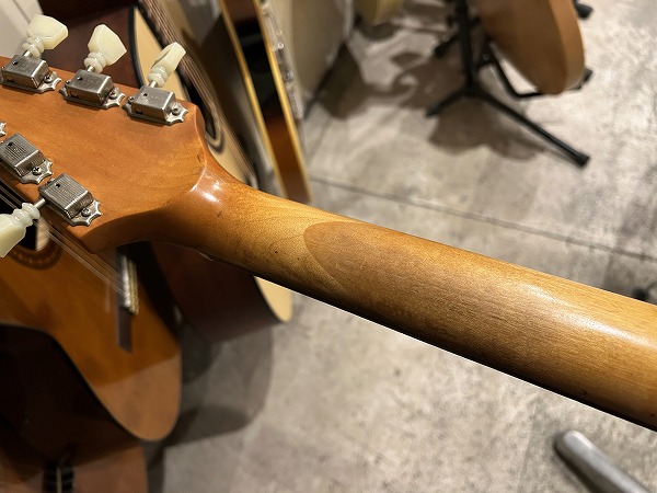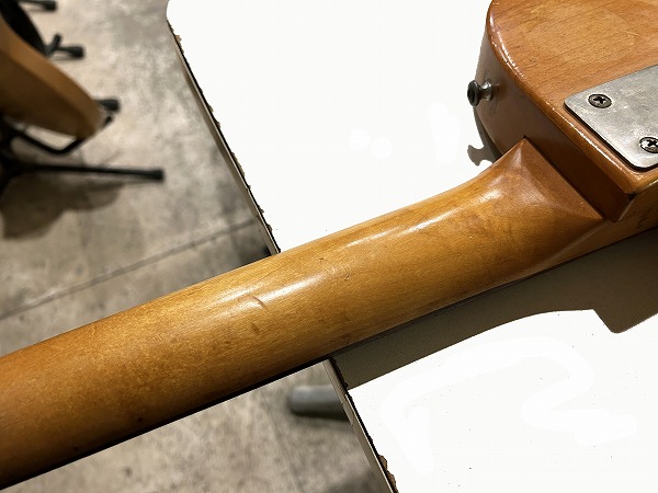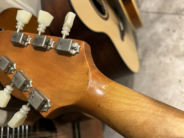 外観的には相応に多数の打痕、表面の擦れ、傷、使用感、経年感がある相応のプレイヤーズ・ヴィンテージ・コンディションですが、ナチュラルなレリック感のある雰囲気は抜群です。ヘッド裏6弦側のナット横に、おそらく接着剤のはみ出しによる接着剤跡がありますが、使用上は特に問題ありません。傷、使用感、経年感は多数ありますが、全体的に丁寧にクリーニング、磨きも入れており、綺麗なコンディションになっております。ケースは当時付属品かどうか不明ですが、70sのGibson