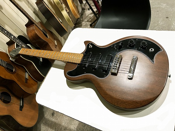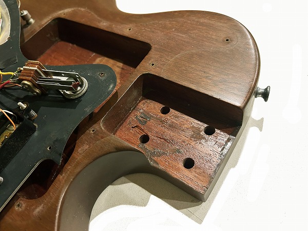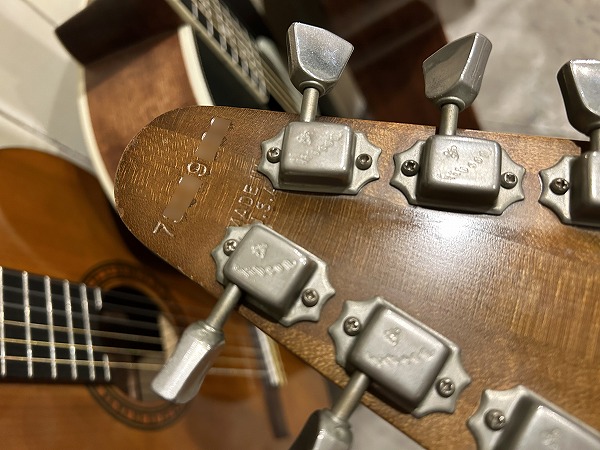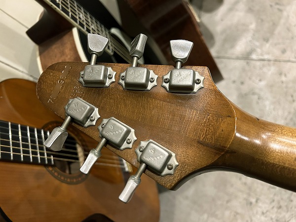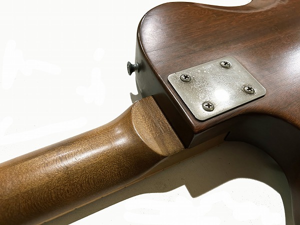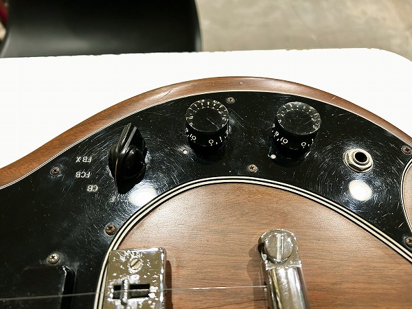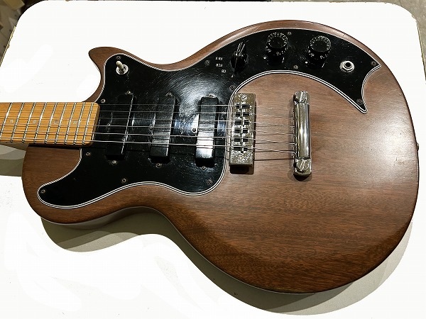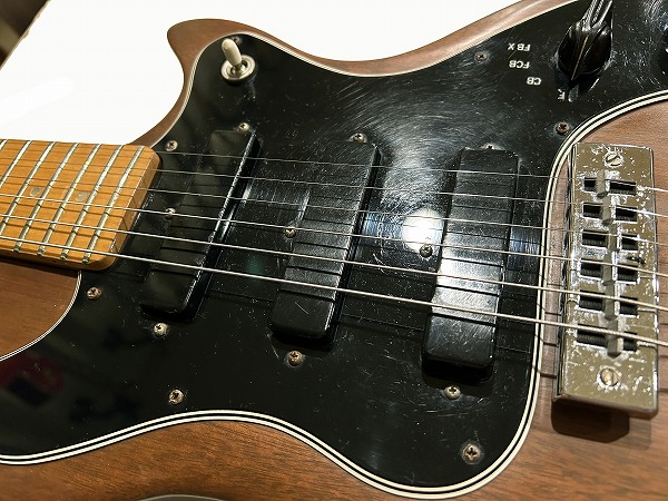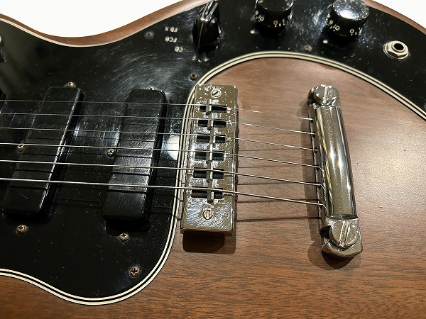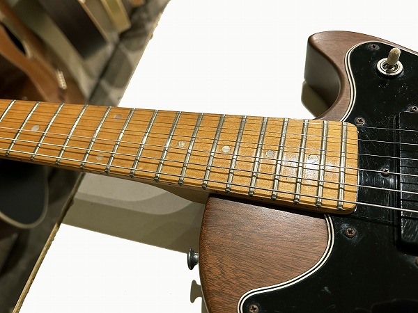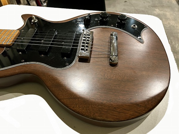 Toggle SWの多彩なコントロールを持っているのが大きな特徴です。今回入荷したのはヘッド裏シリアル「7***9***」の1979年製の後期仕様の1本です。レス・ポール系シェイプのマホガニーソリッドボディに、独自デザインのピックガードを装着、ネックはメイプル3Pの堅牢な作りにメイプル貼り指板というこちらも特徴的な仕様、ジョイントは4点止めボルトオン仕様です。ヘッドシェイプはフライングVヘッドデザインという個性的かつとても格好良いルックスです。ブリッジは70sの特徴でもある、ワイドトラベル・チューン・オー・マチック・ブリッジにストップテイルピースタイプ、ペグはGibsonロゴ入りのタイプです。