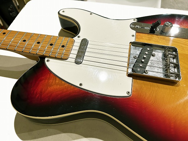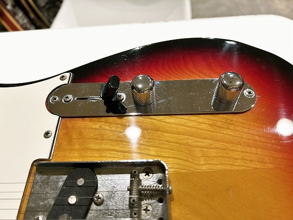 TELECASTER純正ロゴに変更され、オーバーラッカーされています。ペグはFender純正Fキーに交換されています。また、ネックジョイントプレートもFマーク付きのFender純正品に、ブリッジ、ブリッジプレートもFender製に交換されています。ブリッジサドルはヴィンテージ・スパイラルタイプの3サドル仕様です。クラシカルなヴィンテージライクな仕上がりで、主要ルックス部をFenderに変更している為、パッと見はFender製かなと思うほどで、かつとてもクールなルックスです。ピックアップ、ポット、スイッチ、配線など電装系はオリジナルどうか不明ですが、交換されている可能性もあります。ピックアップは配線を見ると布被膜、クロスワイヤー等ではありませんので、Fender