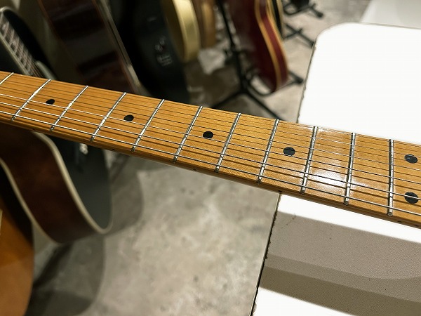 プレイコンディションは良好です。ネックはロッド調整済みで、反りも無く真っ直ぐで良好な状態に調整済です。ロッドはまだ若干の余裕があります。フレットは相応に減りが見られ、若干のへこみも見られますが、まだ6分~7分程度は残っており、大きなへこみや弦溝もありません。丁寧に磨きも入れており、大分光沢も取り戻しています。指板も若干の小傷、使用感はありますが、大きな減りやダメージは無く、こちらも丁寧にクリーニング、磨きを行なっています。ブリッジサドル弦高調整ビス、オクターブ調整ビスも、錆びつきによる固着等も無く、調整上の動作も良好です。全体的にしっかりとメンテナンス、セットアップを施しており、弦高はローアクションで弾きやすく、ビビリやつまりも無く、良好な出音になっています。現在弦高は12フレット上1弦1.5mm、6弦1.5mmです。電気系統も各部メンテナンス、チェック済です。出音、各コントロール共に良好で問題ありません。プレイコンディションは良好で、調整、セットアップ済の良好なグッドプレイコンディションです。