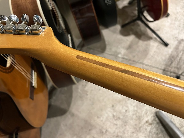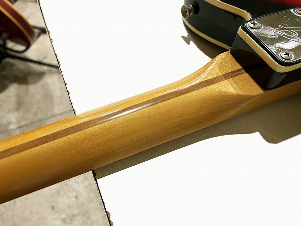 ボディはセンで、アッシュに似つつも独特なうねりのある杢目が個性的です。カスタムテレキャスタータイプでバインディング付きに3トーンサンバースト、情報によると塗装はラッカー塗装となっており、かなり本格的な仕様、ルックスです。ネックはメイプル1Pで、ネックエンド部に「CT-600」の手書き表記があります。カスタム点として、ヘッドロゴはFender