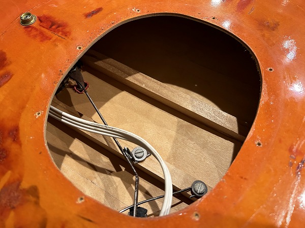 NO. D196609」「PAT. NO. 3,134,288」です。メイプルホロウボディにメイプルセットネック、エボニー指板、バータイプブリッジにビグスビー搭載、ピックアップはオリジナルのフィルタートロンです。全体にウェザーチェックが入り退色したオレンジカラーが雰囲気抜群で、リアル・ヴィンテージならではの非常に存在感ある格好良いルックスです。