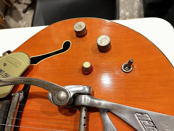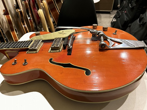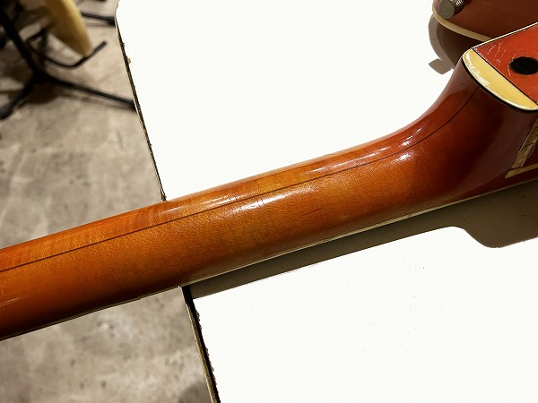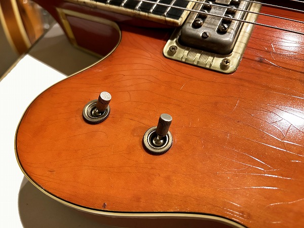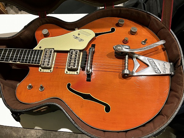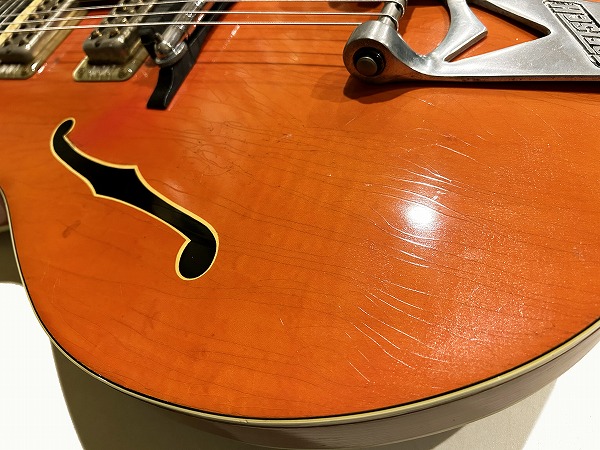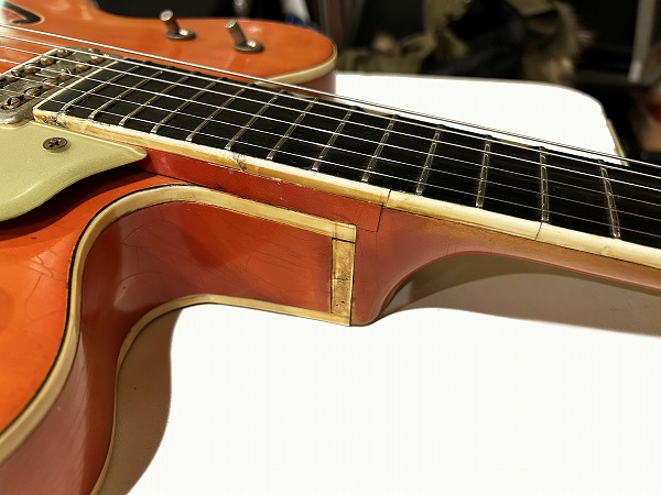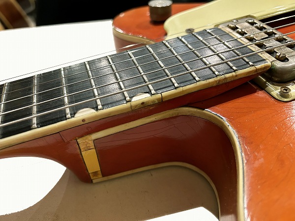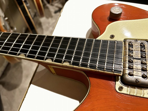 プレイコンディションは良好です。ネックは真っ直ぐに調整済、ロッドも余裕があります。フレットは相応に減り見られますが大きなへこみや弦溝も無く、ローアクションセッティング可能で出音も良好です。ミュート機能も動作生きています。各コントロールも全て正常で出音問題ありません。外観的には相応のヴィンテージコンディションです。ヴィンテージ・グレッチの弱点であるバインディングの劣化ですが、こちらボディバインディングはそれほどダメージありませんが、ネックバインディングとネックジョイント部のバインディングに劣化ダメージが見られます。ネックバインディング1弦側ローポジション部に欠損がありましたので、補修修理・塗装修理を施しております。周辺部と違和感が無い様に修理されており、外観的にも演奏上も問題無く仕上がっています。その他のひび割れ箇所も接着補強しておりますので、現在使用上問題ございません。その他ボディ、ネック、ヘッド共に塗装は全面にウェザーチェックが入っており、色味の退色、傷、経年感なども含め、雰囲気は抜群です。雰囲気、風味を損なわない程度に丁寧にクリーニングと磨きを入れており、とても綺麗なコンディションにはなっております。ハードケースはプレートが付いていませんが純正のものと思われるものが付属いたします。