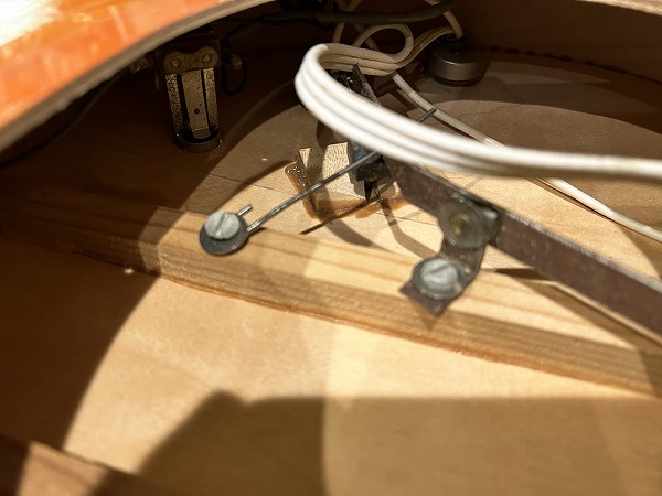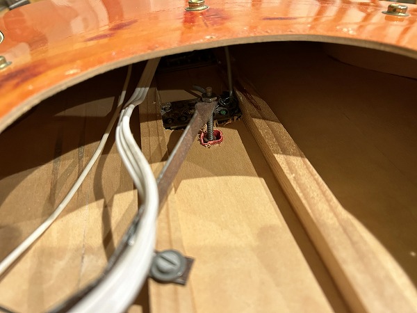 薄胴のダブルカッタウェイ、プレート無しの蹄鉄ヘッドインレイ、ダミーFホールのボディにミュート搭載、バックの座布団パッド、0フレット仕様など特徴的な仕様を備えた1964年製の1本です。パッドを外したカバーに刻印のPATナンバーは「PAT.
