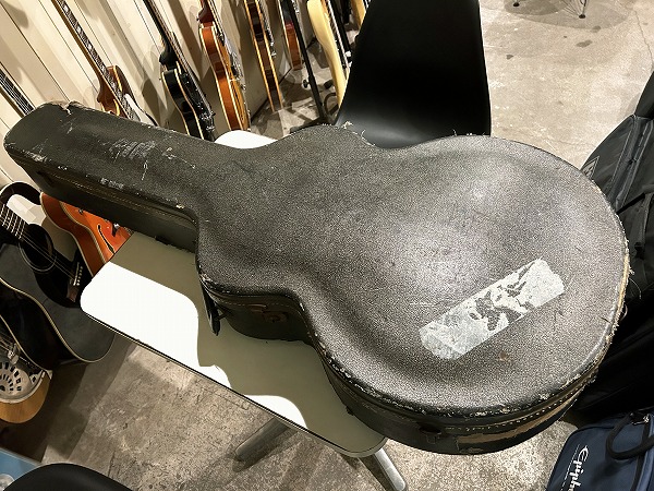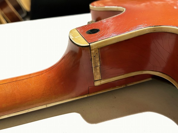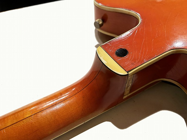 外観的には相応のヴィンテージコンディションです。ヴィンテージ・グレッチの弱点であるバインディングの劣化ですが、こちらボディバインディングはそれほどダメージありませんが、ネックバインディングとネックジョイント部のバインディングに劣化ダメージが見られます。ネックバインディング1弦側ローポジション部に欠損がありましたので、補修修理・塗装修理を施しております。周辺部と違和感が無い様に修理されており、外観的にも演奏上も問題無く仕上がっています。その他のひび割れ箇所も接着補強しておりますので、現在使用上問題ございません。その他ボディ、ネック、ヘッド共に塗装は全面にウェザーチェックが入っており、色味の退色、傷、経年感なども含め、雰囲気は抜群です。雰囲気、風味を損なわない程度に丁寧にクリーニングと磨きを入れており、とても綺麗なコンディションにはなっております。ハードケースはプレートが付いていませんが純正のものと思われるものが付属いたします。