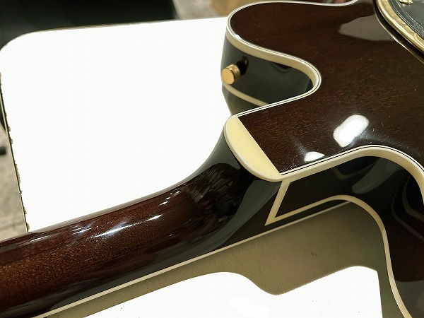 17インチサイズ、厚み2インチのダブルカッタウェイボディはラミネートメイプルのフルアコ構造となっており、フルサイズ・フルアコ構造によるハウリングを抑えるべく、fホールはダミーとなっているのも大きな特徴です。これにより、フルアコならではの箱鳴り感とウォームでスイートなトーンながら、ハリのある粒立ちとタイトなサウンドを持っているのが特徴的です。ネックもメイプルで指板ローズウッドです。ローズウッドも黒々とした色味のエボニーと見紛うような良質材で、サウンドも瑞々しくタイトでクリアーです。0フレット仕様、ブリッジはバーブリッジタイプ、ビグスビー搭載で、トレモロ横にブリッジミュートスイッチを搭載していいるのがこの年式の大きな特徴です。いわゆるダブルミュートと呼ばれる仕様で、赤フェルトのルックスが本格的な雰囲気を高めています。このスイッチをONすることによって、ブリッジとピックアップの間のスポンジが持ちあがり、ブリッジミュートが出来る様になっています。
